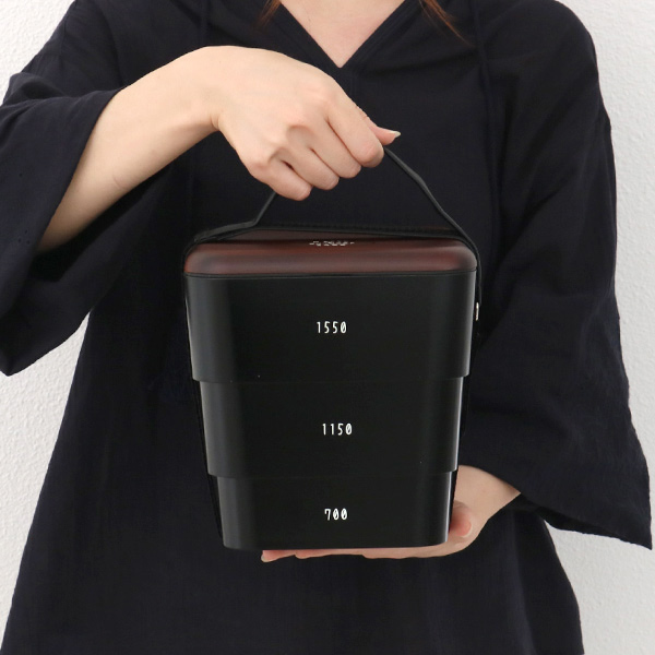 たっぷりと入るおしゃれなデザインの3段重です。下から、700ml・1150ml・1550mlとそれぞれの容量がかわいい文字で描かれています。ピクニック、運動会、アウトドアだけでなく、木目調のデザインはおせち料理やおうちパーティーでも活躍してくれます。