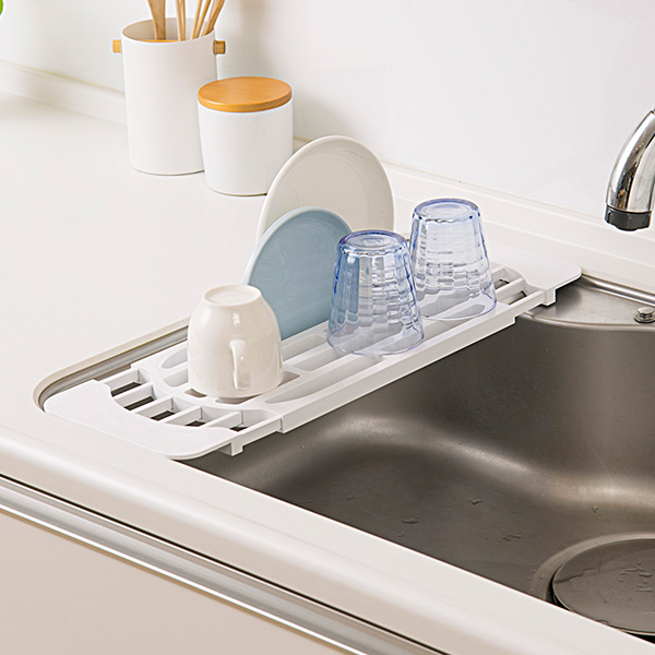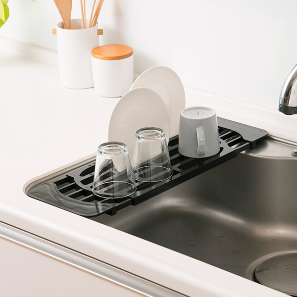 シンクに掛けて水切りができる伸縮水切りトレーです。シンク上に皿を立てて水切りができるので作業スペースを広く使うことができます。