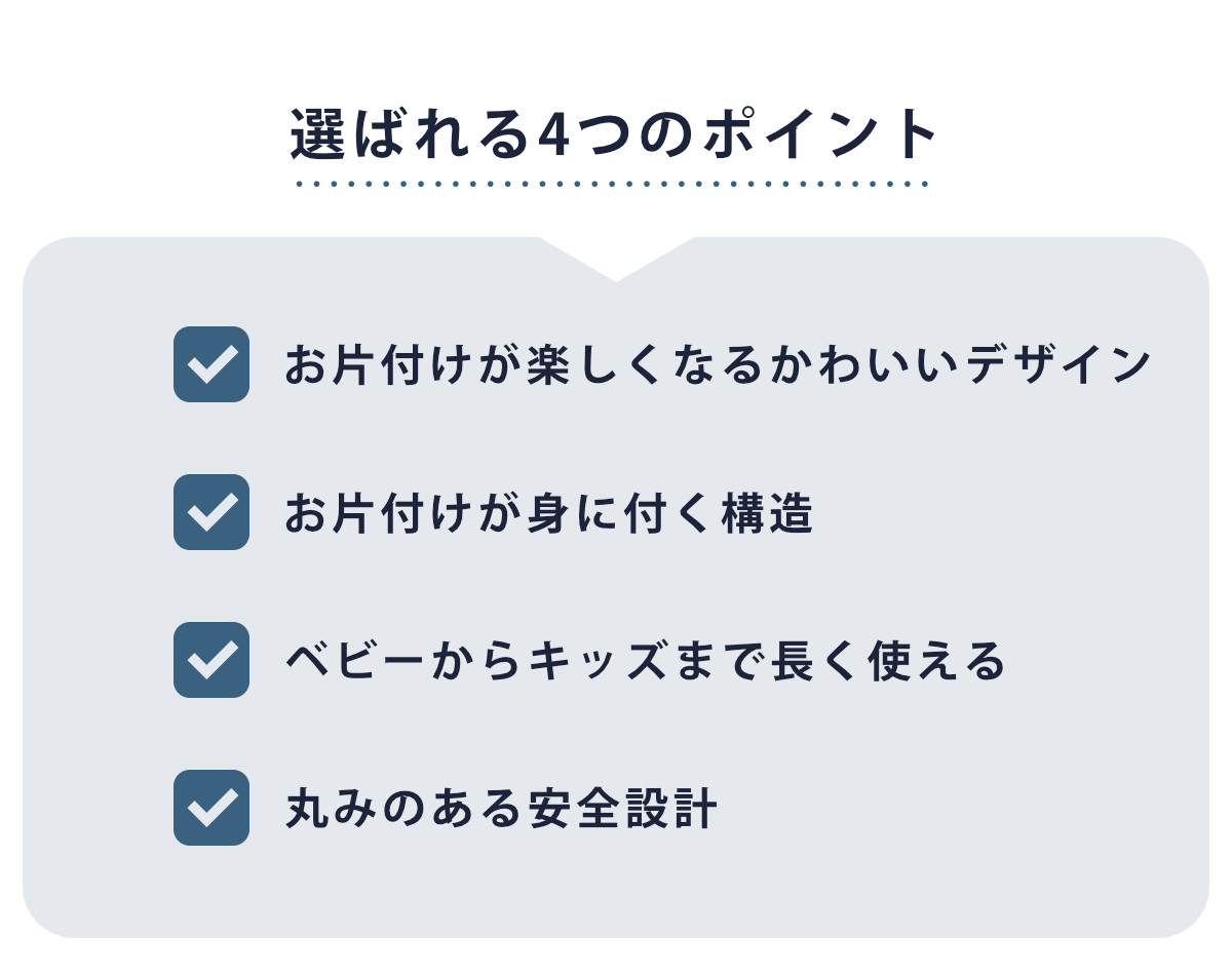 ボックスの中にポイポイ入れるだけで何がどこに入っているかが一目でわかるデザイン。「なにがはいってたかな? どこにおかたづけするの?」とお子様が迷う心配がありません。お気に入りのキャラクターと一緒に簡単に楽しくお片付けの習慣が身につけられます。