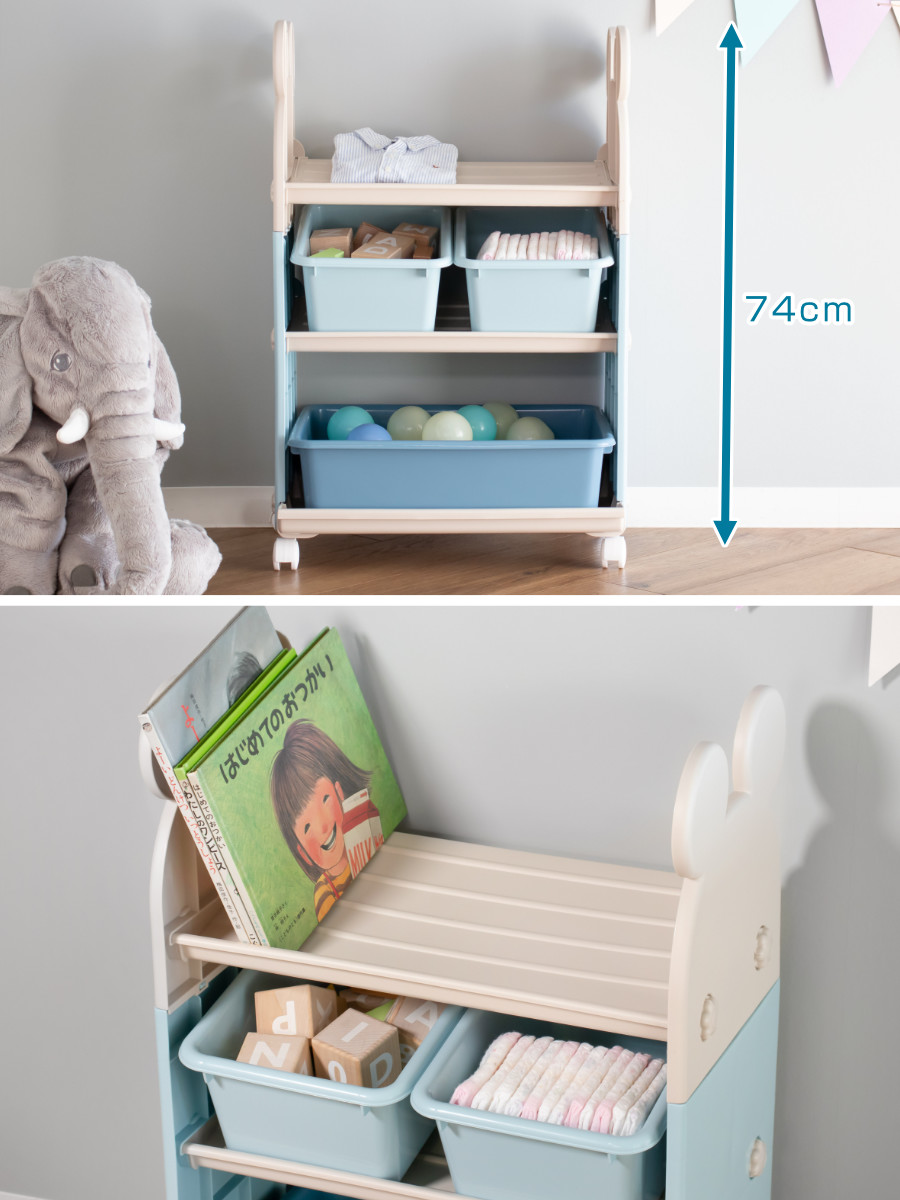 おもちゃの出し入れがしやすく、お部屋に圧迫感も与えない程よい高さです。上段・中段は、前に傾く設計になっているので、収納ボックスを置いたときも中が見やすく、お気に入りの絵本を並べることもできます。