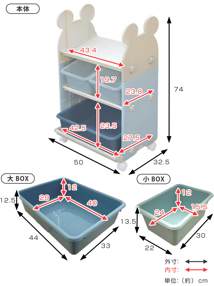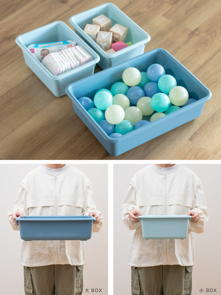 収納ボックスは大と小の2種類あり、小物から大きめの物までたっぷり収納することができます。ボックスごと引き出すことができるので、衣類や大きめの物も入れやすいです。軽くて丈夫なプラスチック製なので、お子様でも持ち運ぶことができます。