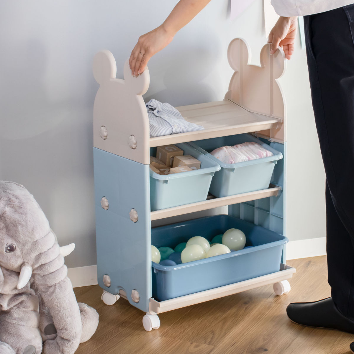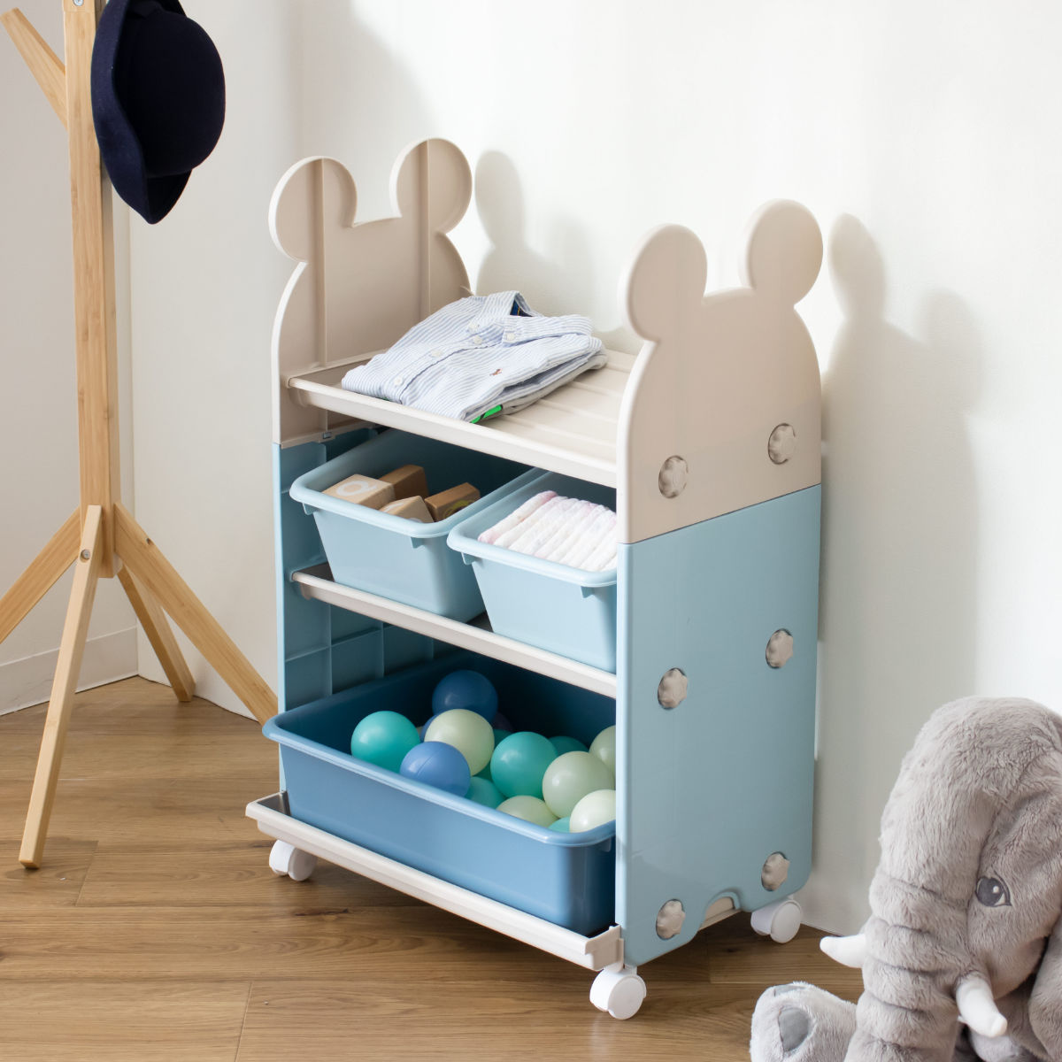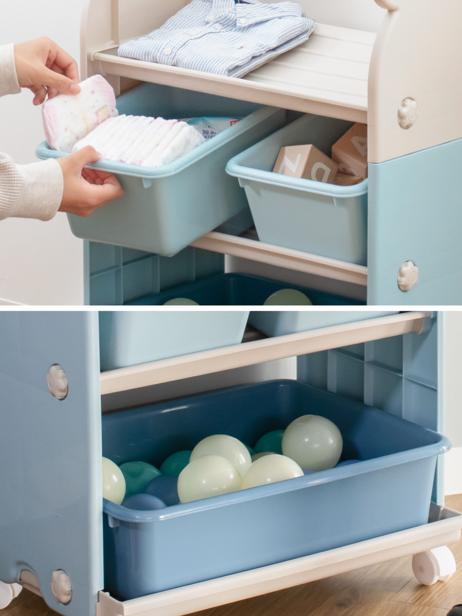 お子様が小さいうちは、おむつやおしりふき、肌着などのベビー用品の収納場所として、お子様の成長とともにおもちゃの収納場所、衣類収納ラックとして長くお使いいただけます。