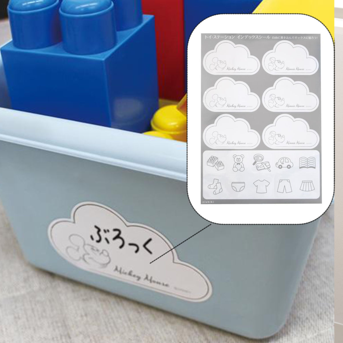 ミッキーマウスとミニーマウスがデザインされたインデックスシールが付属しています。自由に書き込めるので、ボックスの中身がひと目で分かり、お片付けもラクラクです。