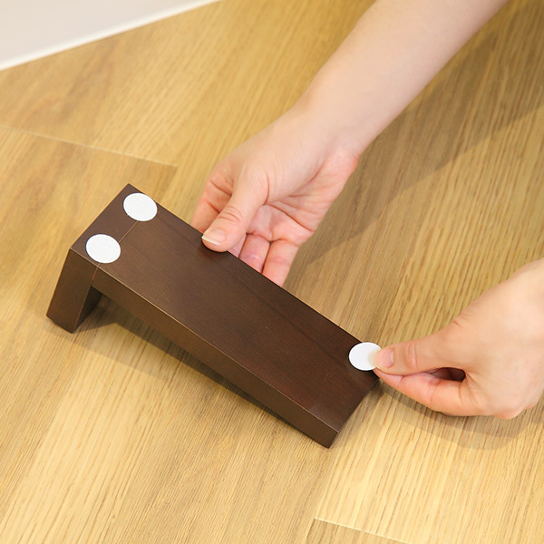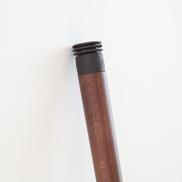 持ち手部分と同じ天然木で作られたスタンド付きです。安定感がありフローリングの傷を防止する保護シールが付いています。