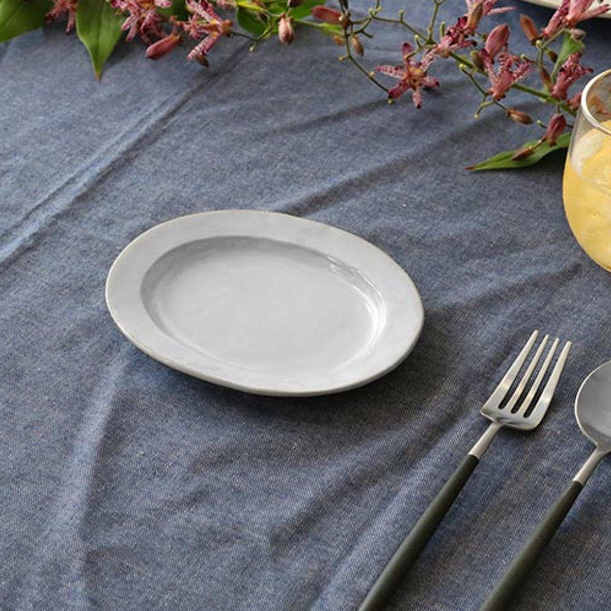 フルーツやナッツ、ソースや醤油を入れたり、大皿料理の取り皿としてなど幅広く使っていただけるサイズのプレートです。リム(ふち)の程よい余白が食卓のアクセントとなり、優しいペールグレーの色味がお料理や野菜の色をより一層引き立てます。