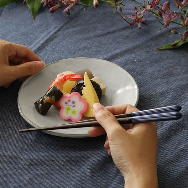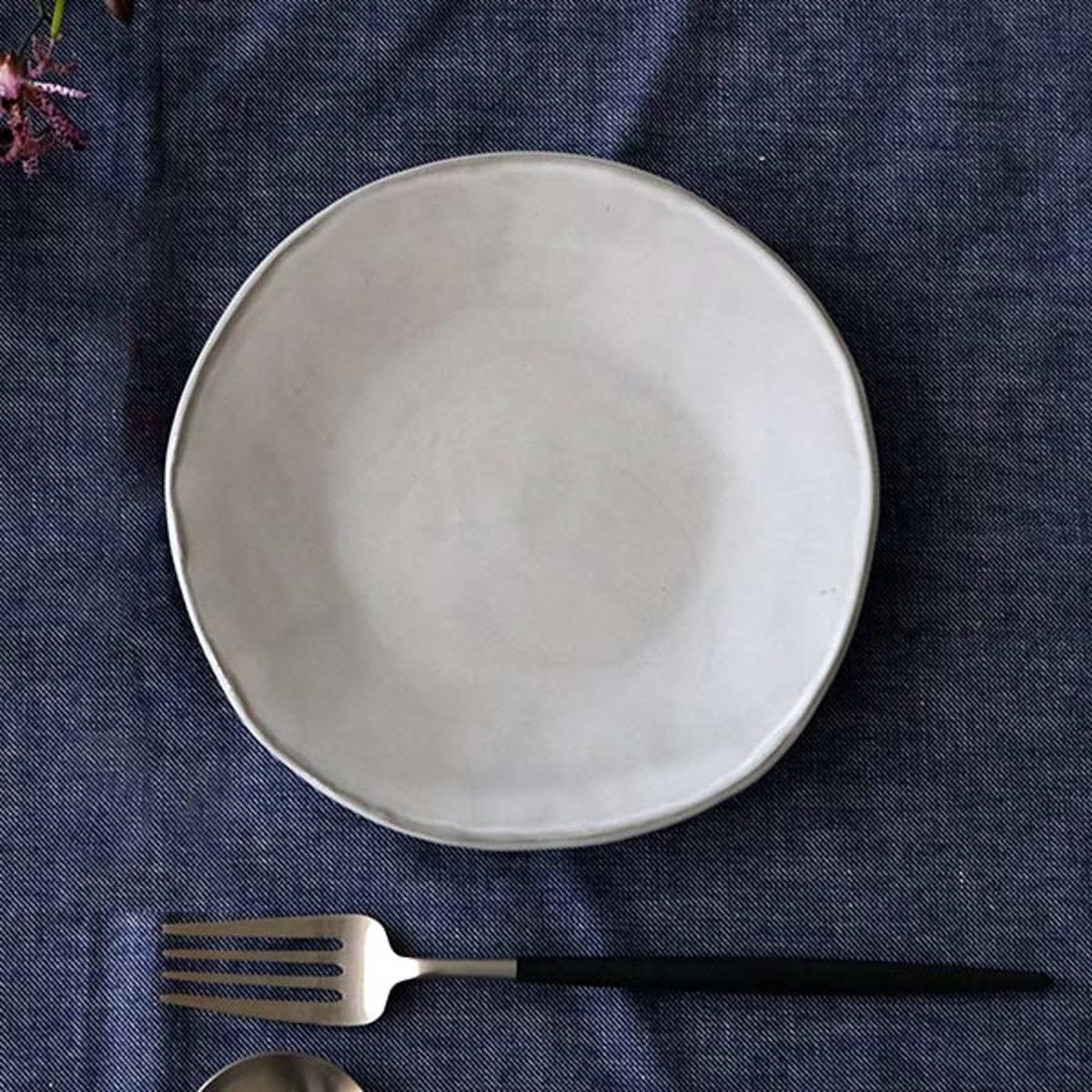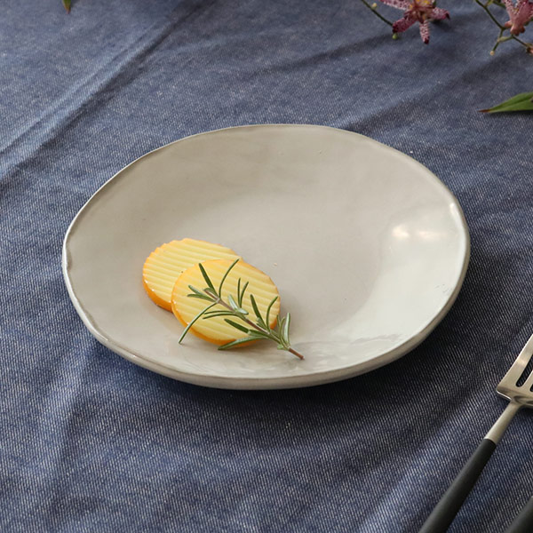 朝食のパンやティータイムのデザート、大皿料理の取り皿としてなど幅広く使っていただけるサイズのプレートです。均一ではないリム(ふち)が食卓のアクセントとなり、優しいペールグレーの色味がお料理や野菜の色をより一層引き立てます。