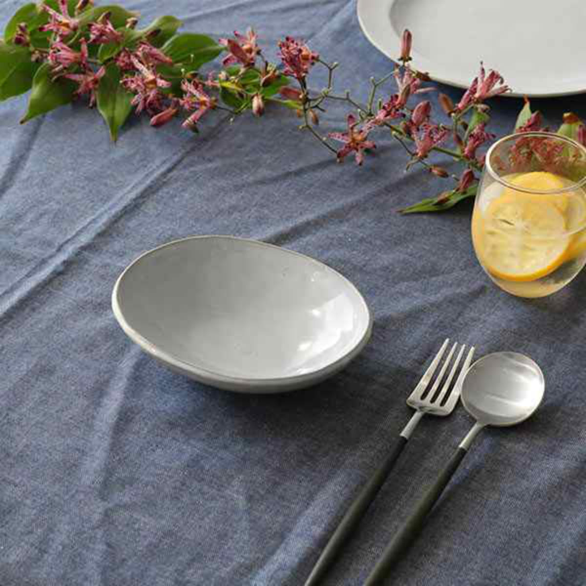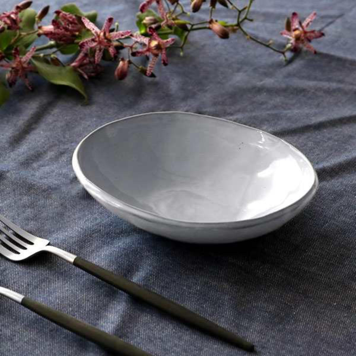 1人分のサラダやお惣菜、大皿料理の取り皿としてなど幅広く使っていただけるサイズのボウルです。均一ではないリム(ふち)が食卓のアクセントとなり、優しいペールグレーの色味がお料理や野菜の色をより一層引き立てます。