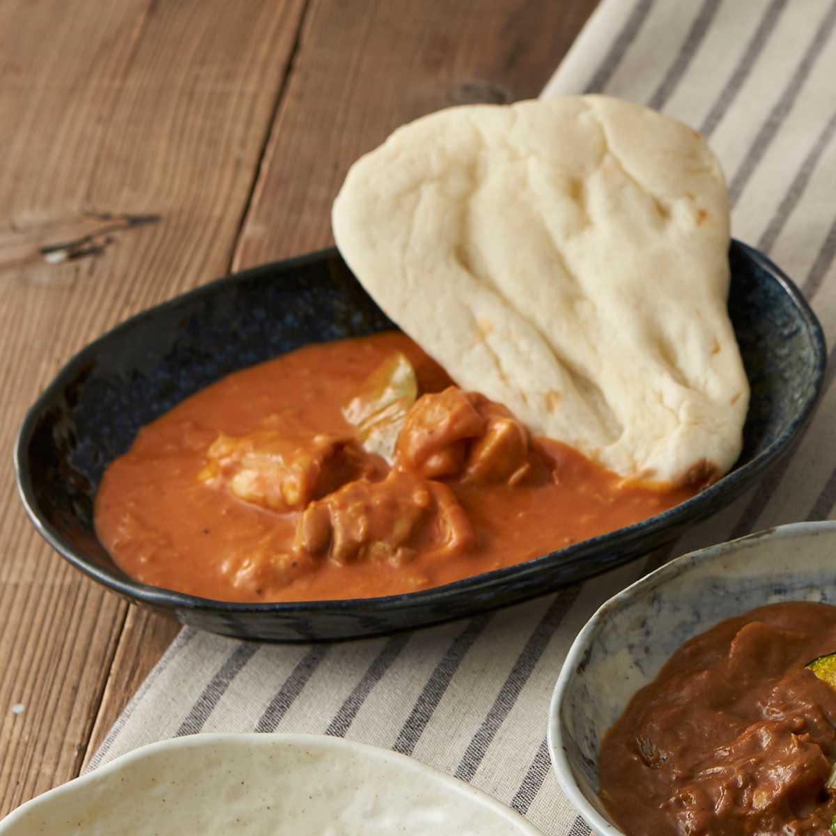 深海をイメージさせるような落ち着いた雰囲気の藍には、まろやかでコク深いバターチキンカレーがぴったり。暗めのトーンなのでお料理をぐっと引き立ててくれます。1人分にちょうどいいサイズ感で、カレーはもちろんワンプレートごはんやパスタにも使いやすいです。