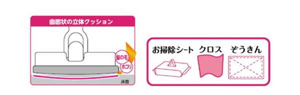 ●髪の毛、ホコリをとりこみやすい曲面上の立体クッションが床面にフィットするのでシート全面で汚れをキャッチします。