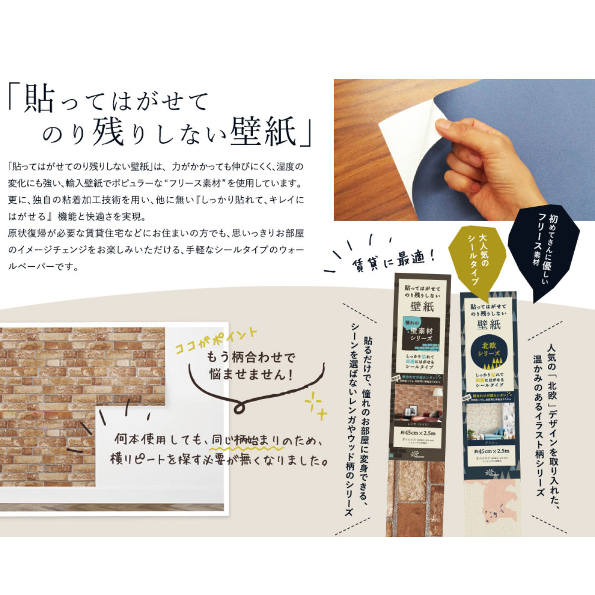 壁紙 貼ってはがせる壁紙 憧れの壁素材シリーズ 45cm×2.5m ( リメイクシート 壁紙シート はがせる壁紙 はがせる DIY 壁紙シール ウォールペーパー 壁 DIYシート 接着剤不要 レンガ ウッド リフォーム 日本製 簡単 カット可能 ) 【レンガ(ダーク)】