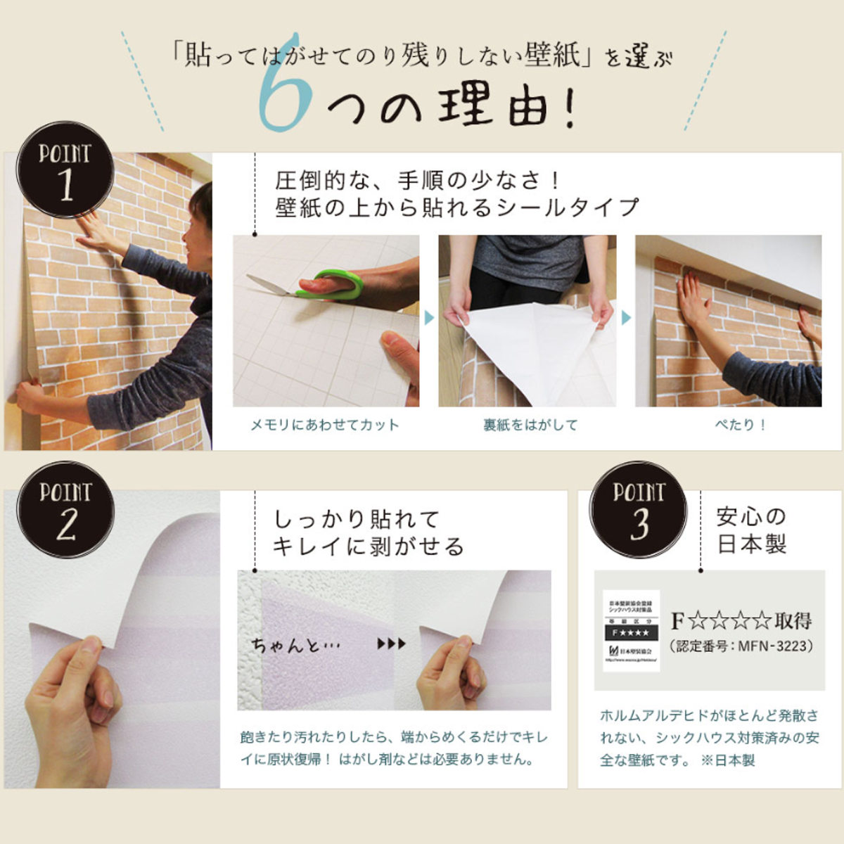 ホルムアルデヒドがほとんど発散されない、シックハウス対策済みの安全な壁紙です。