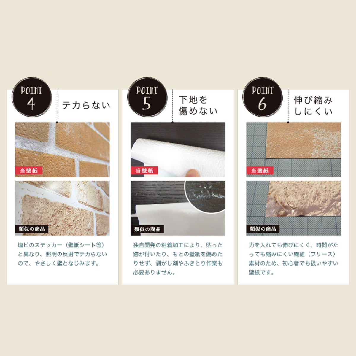 力を入れても伸びにくく、時間がたっても縮みにくい繊維(フリース)素材のため、初心者でも扱いやすい壁紙です。