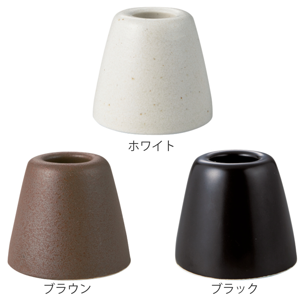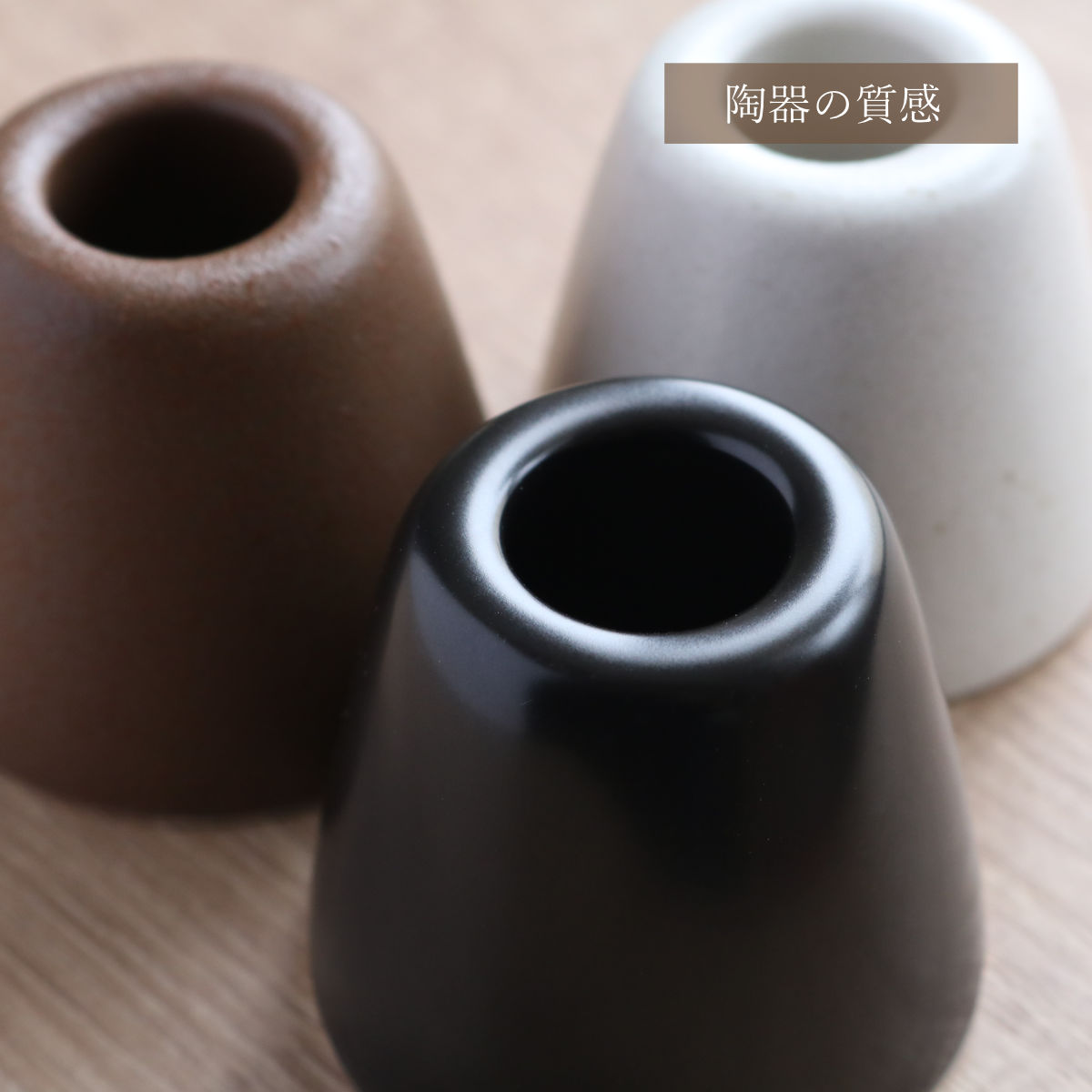 ホワイトとブラウンは素焼きを思わせるマットな質感、ブラックは艶のあるなめらかな質感が特徴。陶器ならではの程よい重みがあり、安定感のある使い心地です。