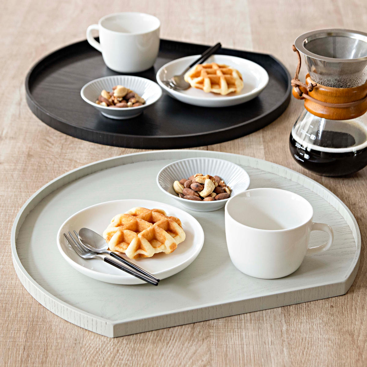 手に馴染む天然木のぬくもりと気品あふれるトレーです。半月型のフォルムが優しげで、和洋問わずどんなお料理も引き立ててくれます。1人分のお茶碗と汁椀、主菜を置けるぐらいのサイズ感です。