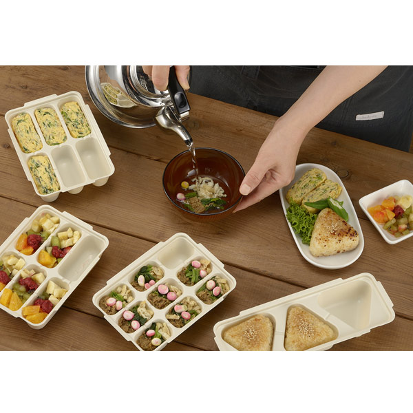 1個分、1食分を適量を小分けにできる容器なので忙しい朝のお弁当作りもサポートします。週末や夜に作り置きして朝はお弁当に詰めるだけでOK!小分けにできるから食材同士がくっつかず1つのトレーで何種類ものおかずを1度に保存できます。