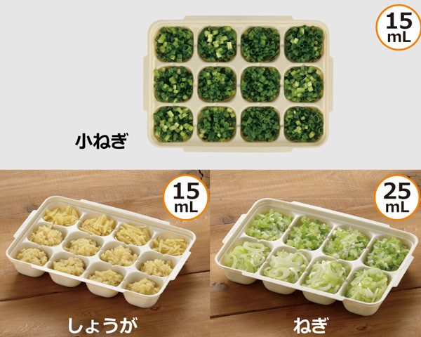 15mlと25mlは、少量しか使わない薬味にぴったりのサイズです。料理に欠かせない存在の薬味ですが少しずつ使うことが多く使い切る前にダメになっていた・・・なんてことよくありませんか?このフリージングパックで小分けに冷凍保存することで無駄なく使い切ることができます。