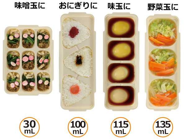 幅広いサイズ展開で1ブロック容量が15ml、25ml、30ml、50ml、100ml、115ml、135mlの7タイプから食材に合わせた形で、専用トレーとして使えます。