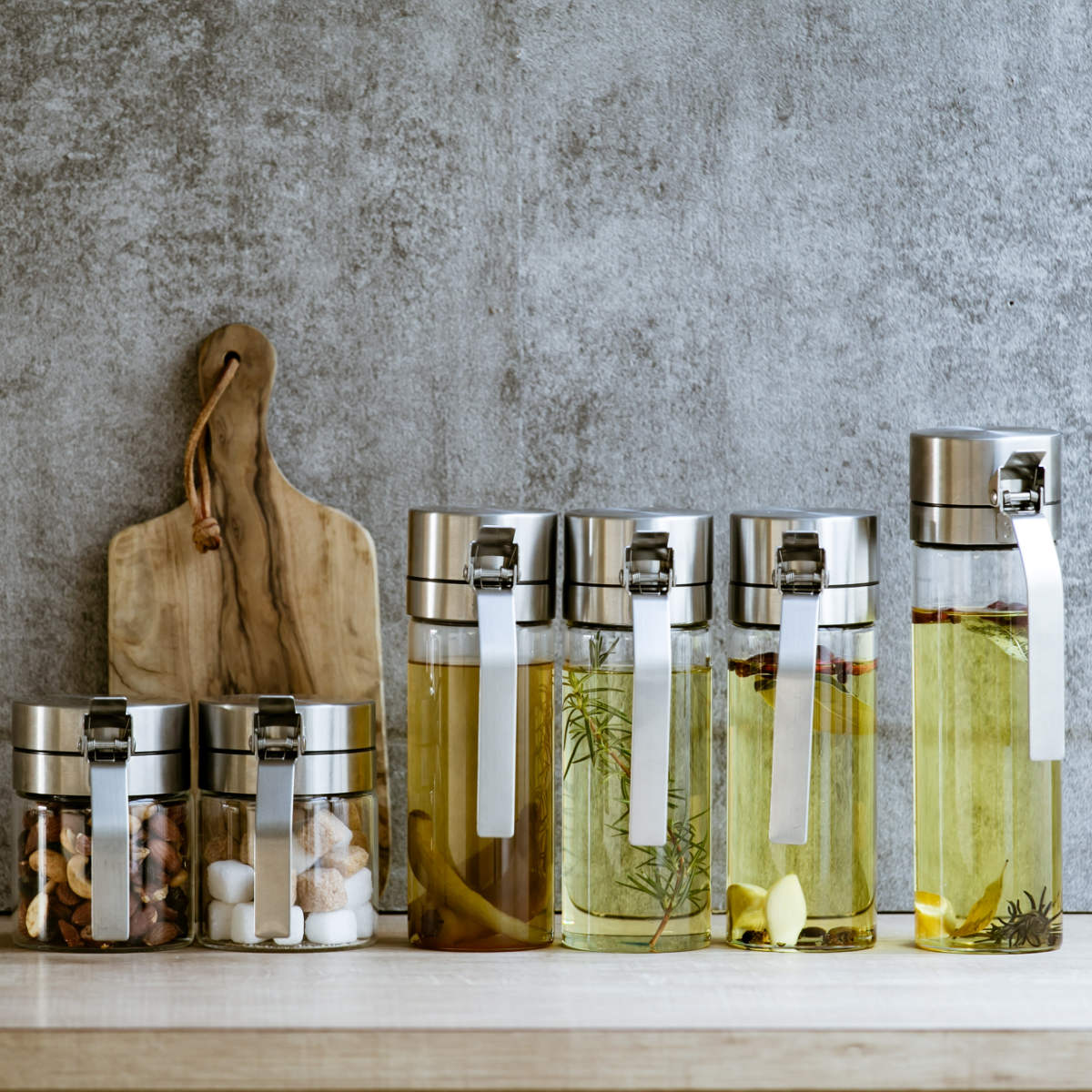 フレーバーオイルやドレッシングを入れて食卓でも活躍。飽きのこないシンプルなデザインは、様々なテイストと相性がよく、数種類出しておいもテーブルに圧迫感を与えません。冷蔵庫保管もOK。ドアポケットに収まります。