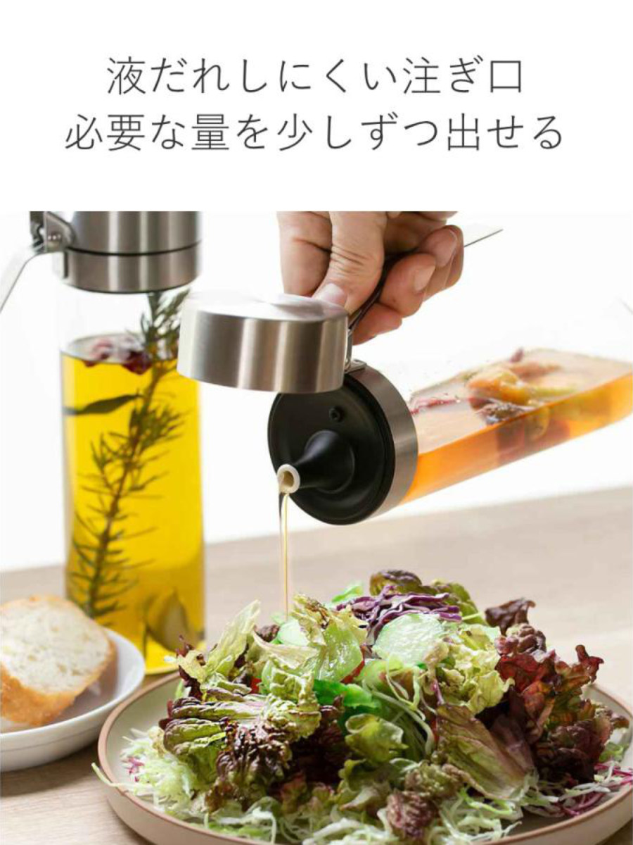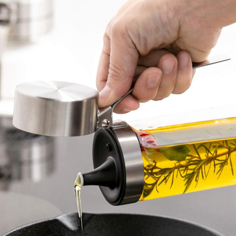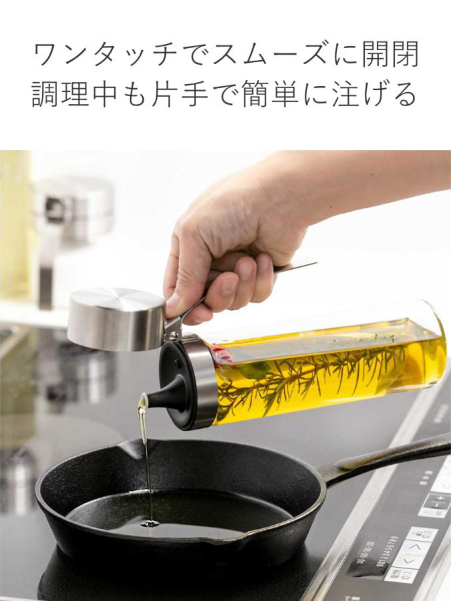 オイルの大敵である酸化を防いでくれる、ガラス製オイルボトルです。使い勝手抜群のスタイリッシュなデザインは、キッチンのみならず食卓でもデイリーに活躍。オイルの鮮度を保ち、毎日のおいしい食事をアシストします。