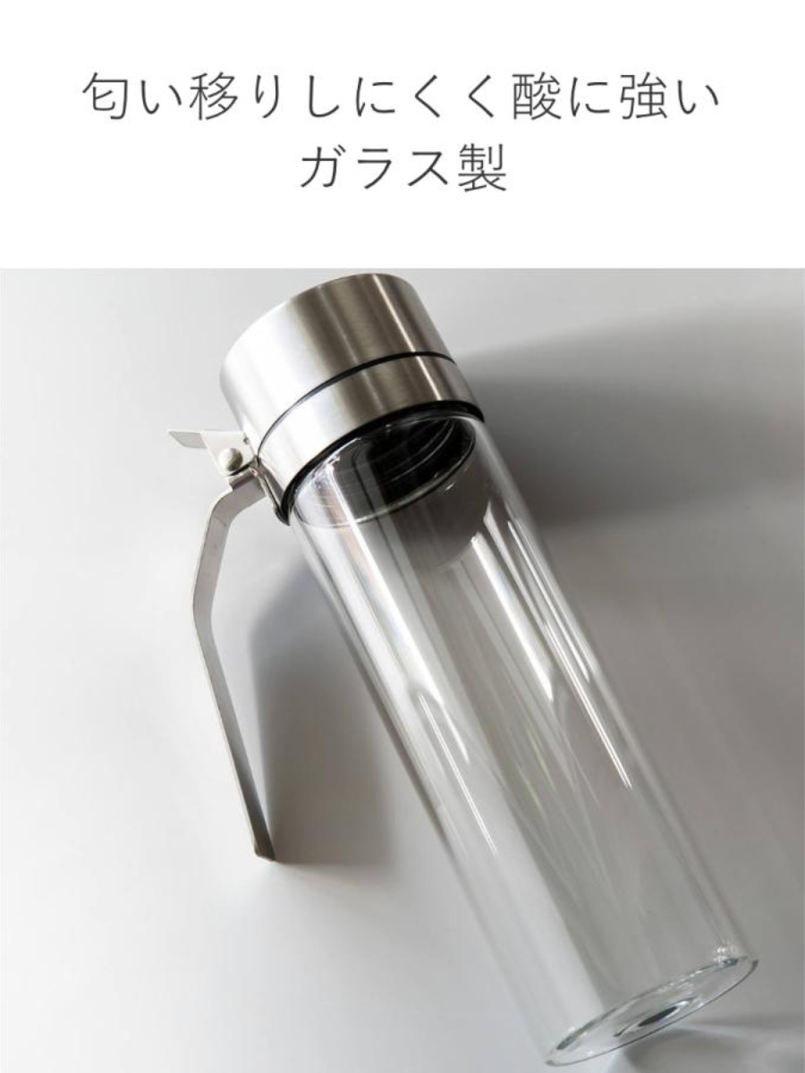 | 材質 | ボトル:ホウケイ酸ガラス フタ:18-8ステンレススチール、ポリプロピレン、シリコン |