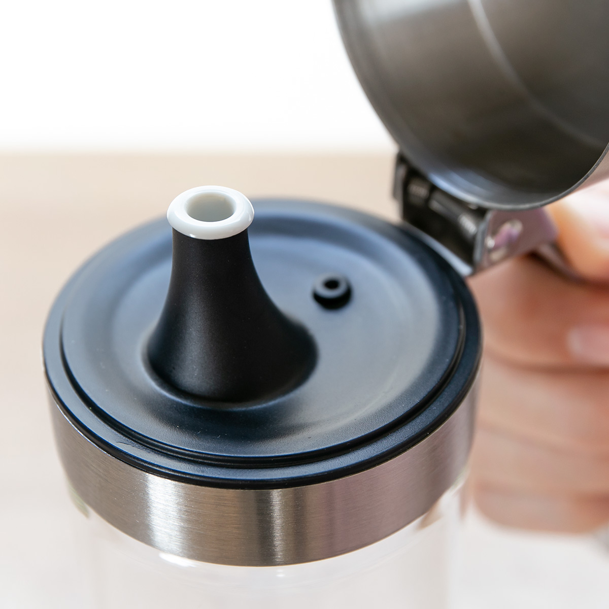 フタは指をかけるだけのワンプッシュオープン式なので、片手でサッと使えます。細口の注ぎ口は適量を注ぎやすく、スッとキレて液だれしないのも使いやすいポイントです。