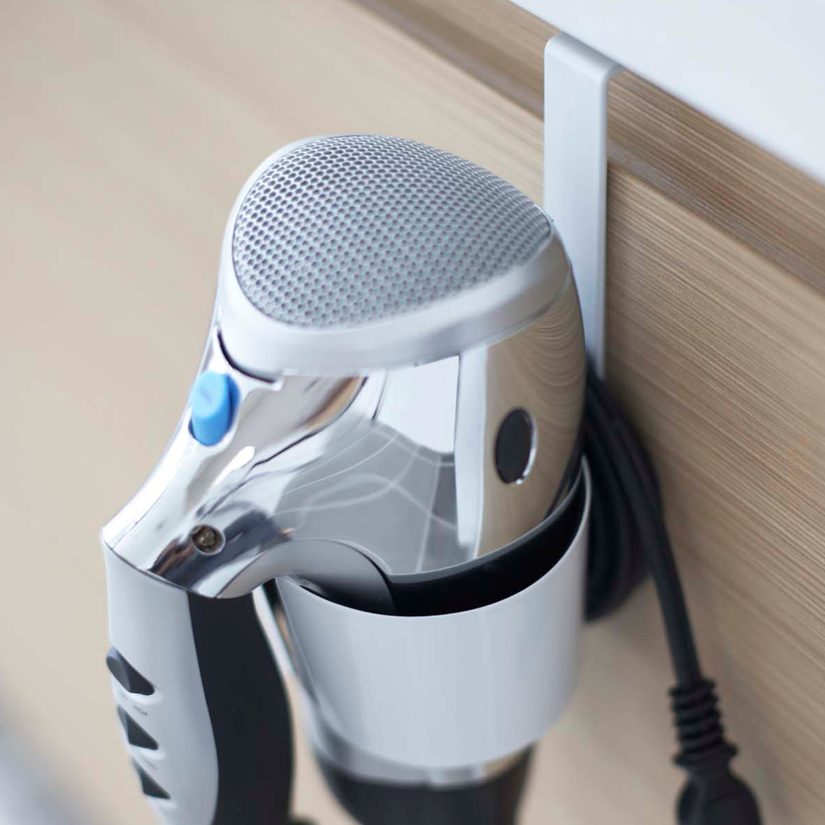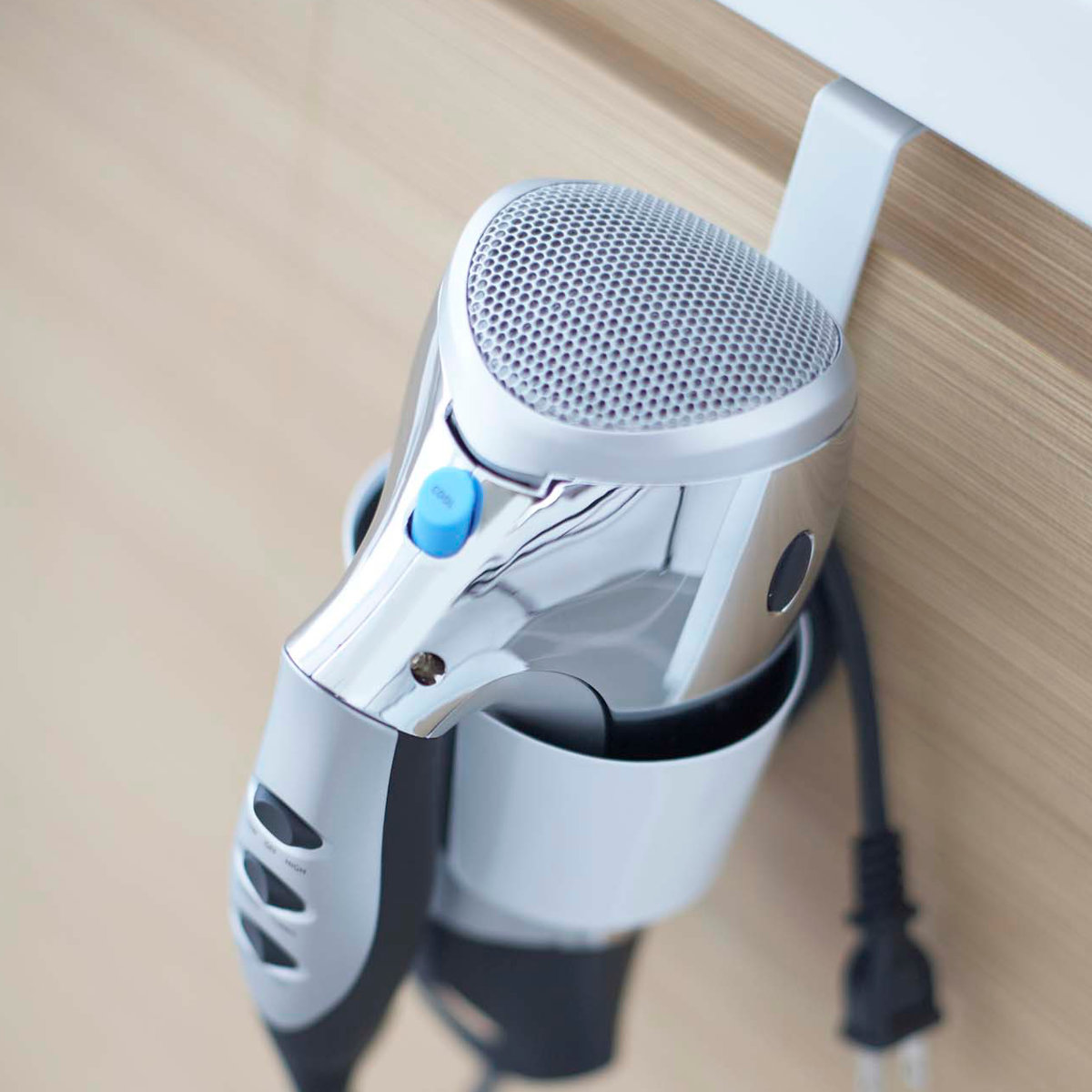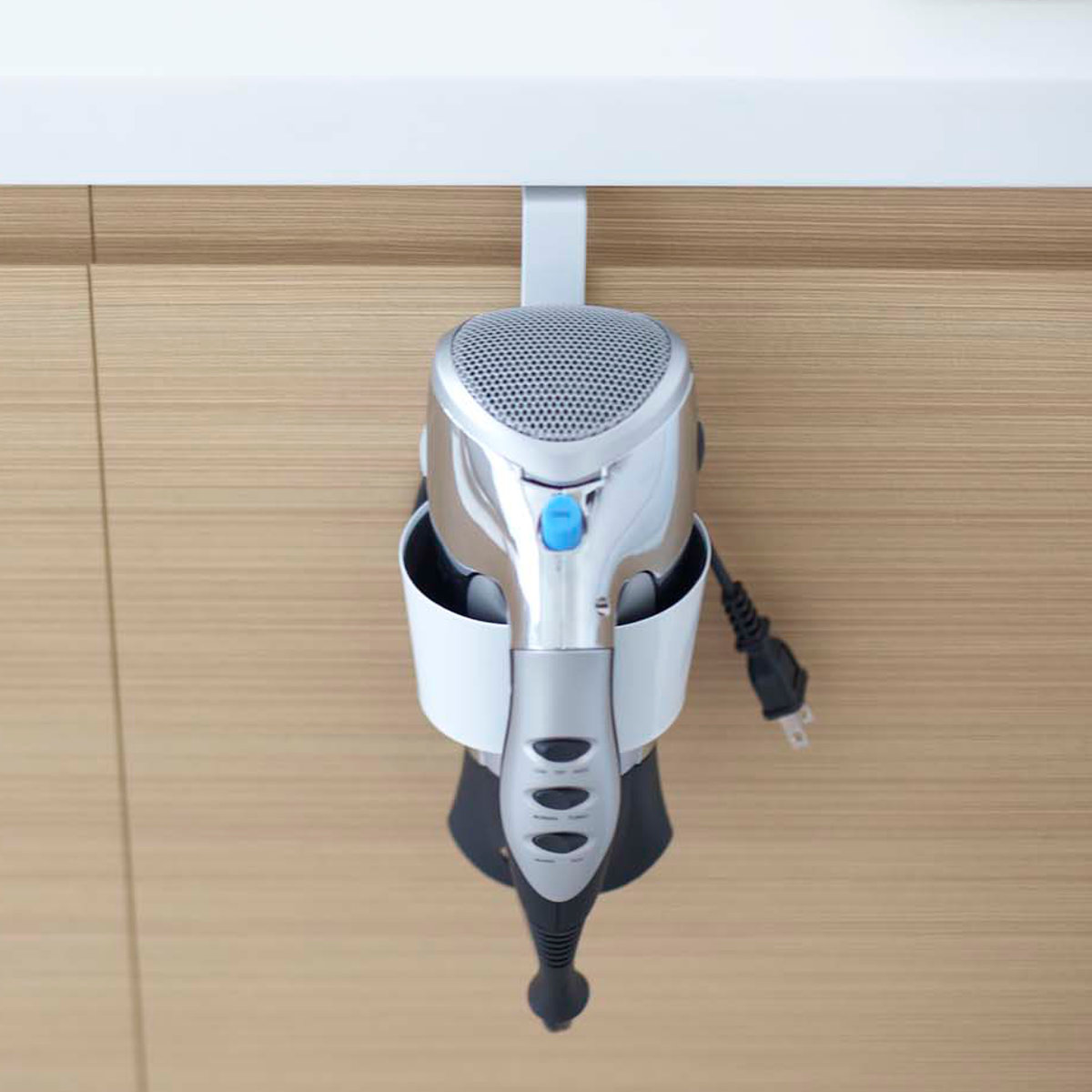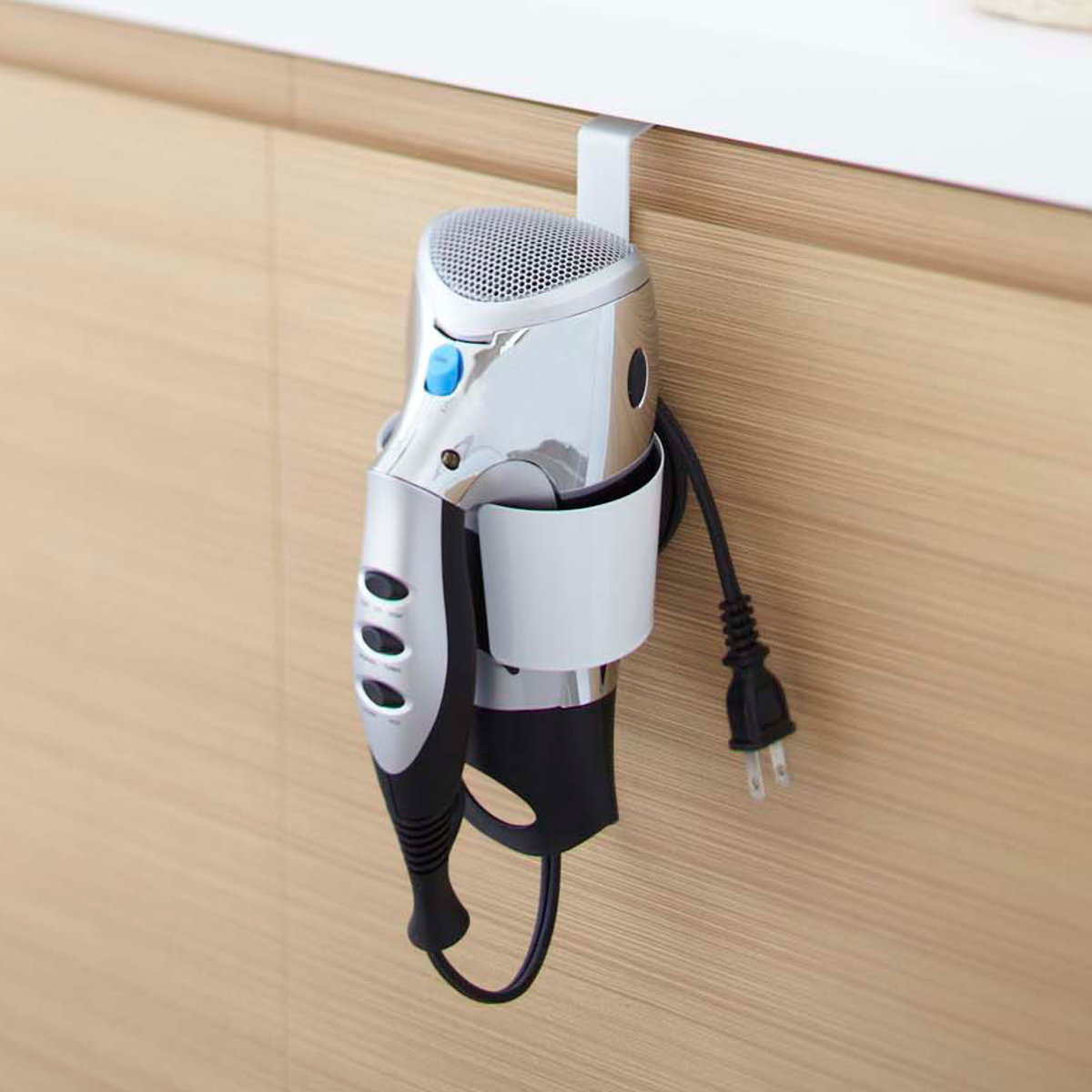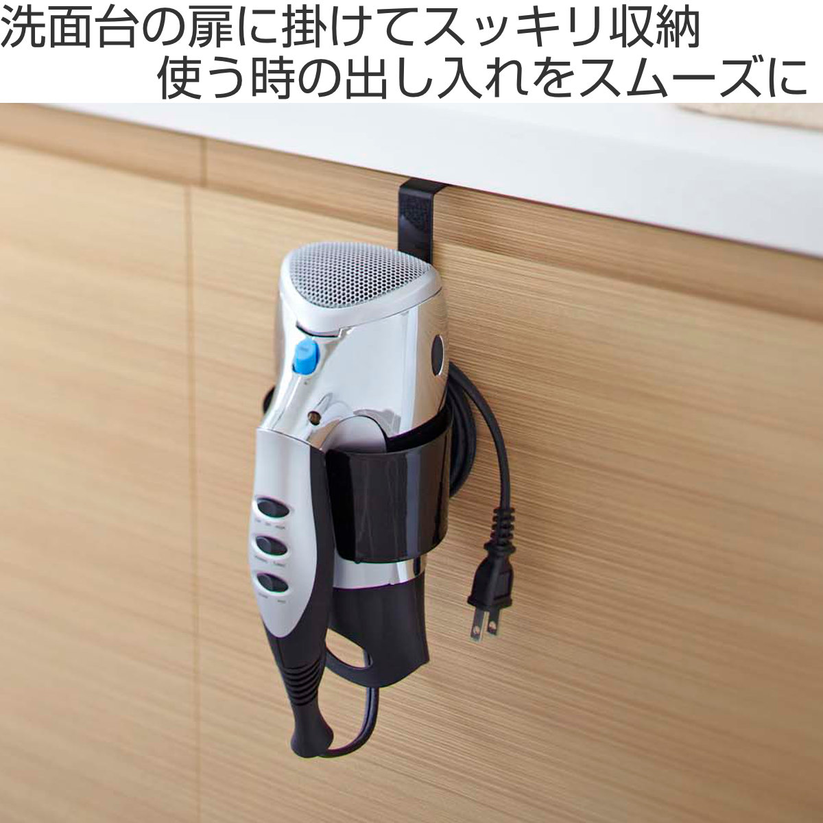洗面台の扉に引っ掛けるだけのドライヤーホルダーです。ゴチャつかず、簡単に収納できます。すぐに取り出せるので使いたい時に使いやすく、洗面所まわりがスッキリ片付きます。