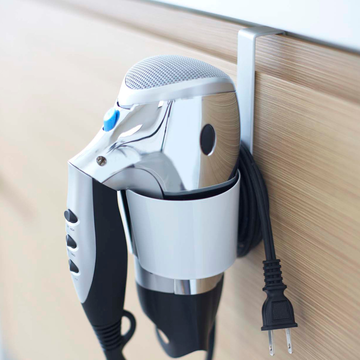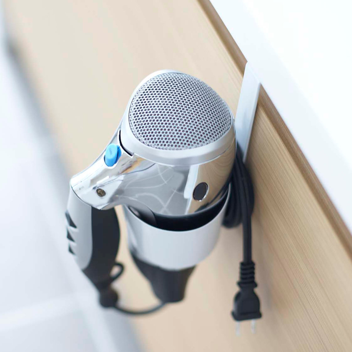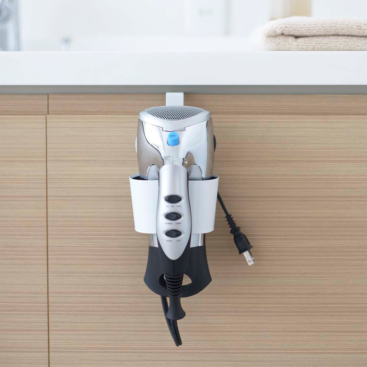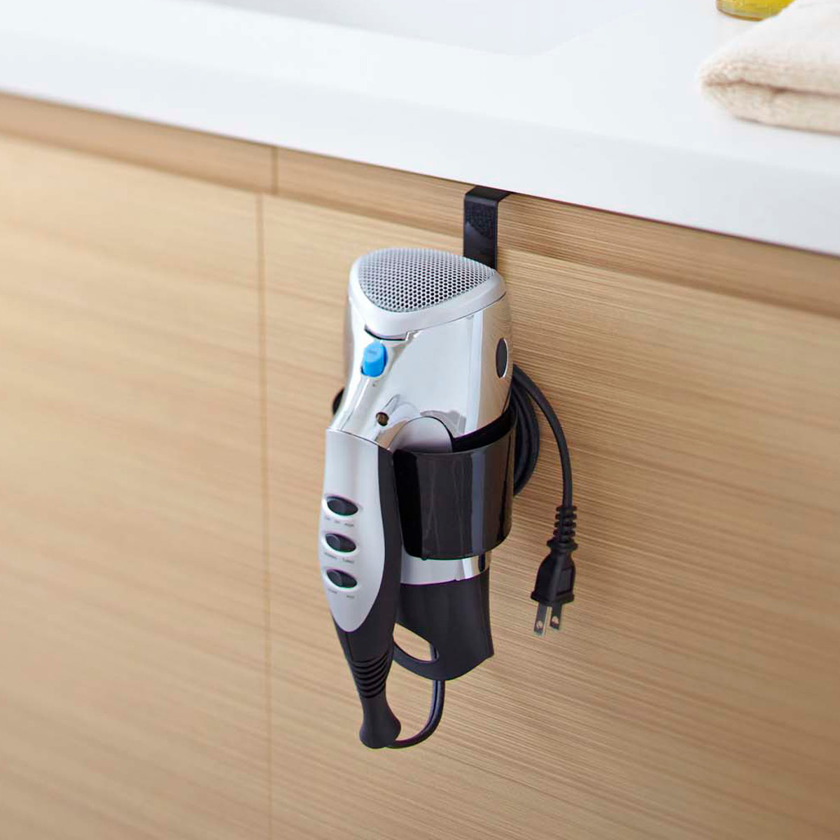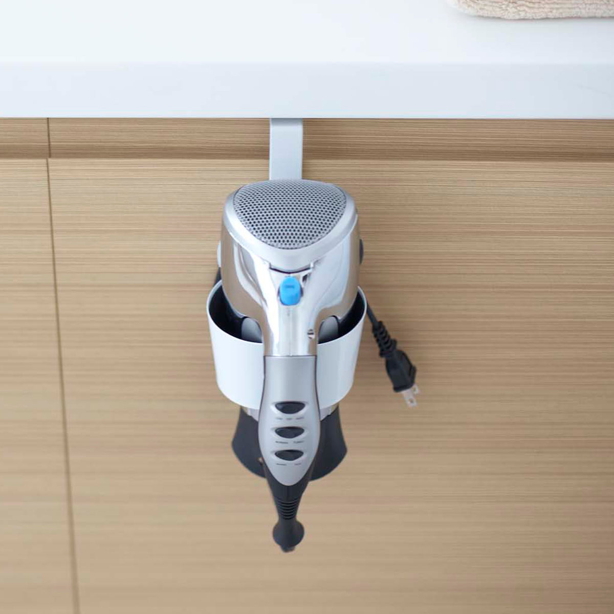 洗面台の扉に引っ掛けるだけのドライヤーホルダーです。ゴチャつかず、簡単に収納できます。すぐに取り出せるので使いたい時に使いやすく、洗面所まわりがスッキリ片付きます。