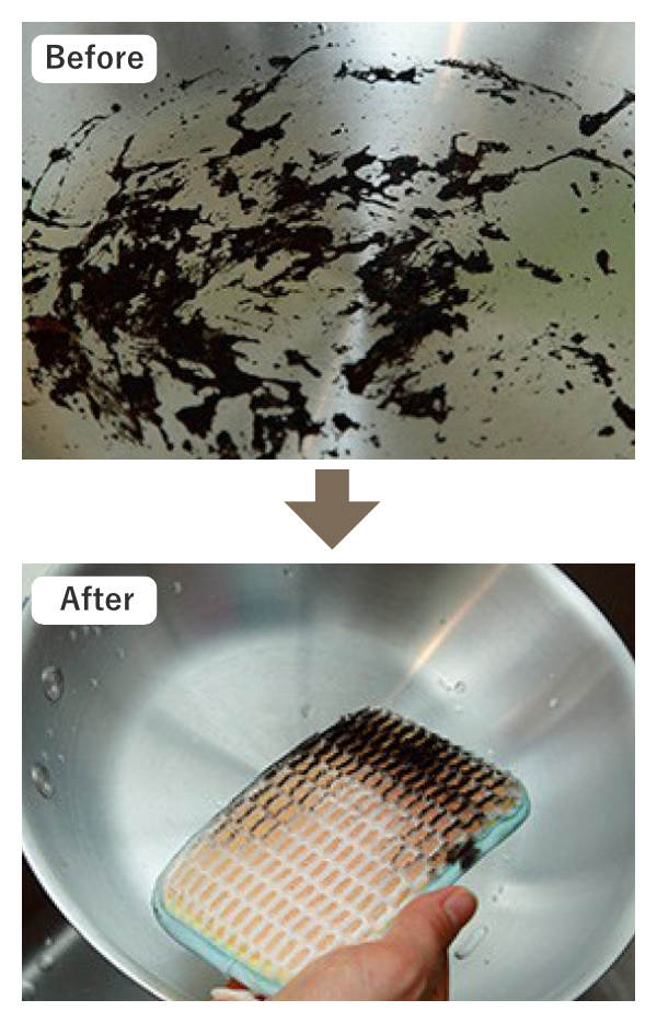 焦げ付きや茶渋汚れ、お弁当箱のこびりつき汚れなどの汚れには、程よい硬さの短い毛を立たせたブラシ面をご使用ください。