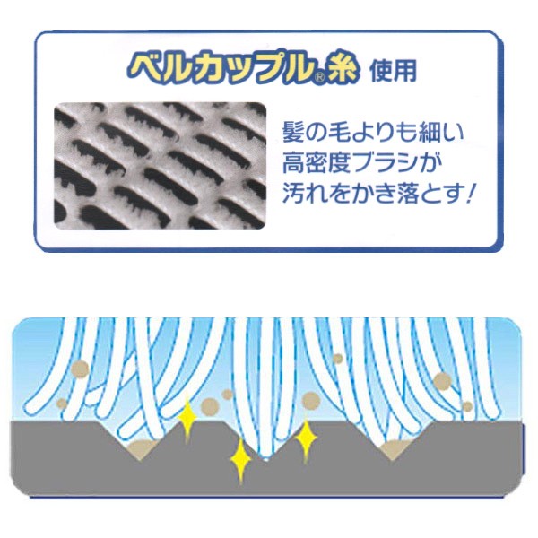 ブラシ面はベルカップル糸を程よい硬さに立毛加工し、ガンコな汚れもすっきり落とします。