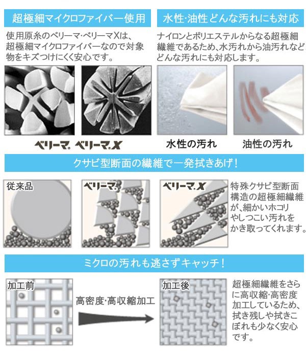 クロス面には、工場のクリーンルームなどのプロの現場でも使用されている極細マイクロファイバーベリーマを使用しています。