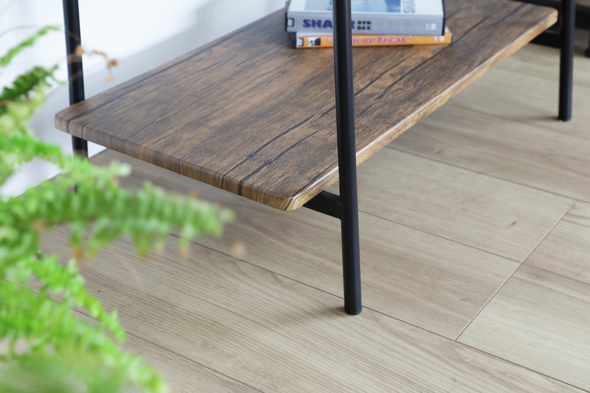 木目をリアルに再現したシートを使用しています。古木調のブラウンの天板とブラックのスチールフレームは、ヴィンテージ調のインテリアにぴったりです。