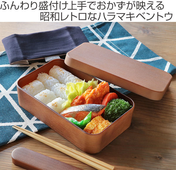 シンプルで使いやすい木目調1段弁当箱にまるで腹巻きのような極太ランチバンドをプラス。カタカナで刻まれた「ハラマキ」のロゴがレトロな雰囲気。周りと差がつくお洒落なお弁当箱です。