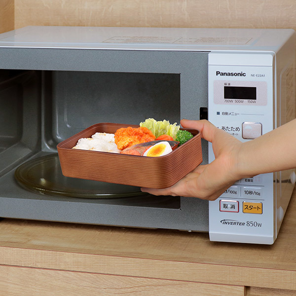 シール蓋以外は電子レンジ対応です。木の温もりあふれるお弁当箱でほかほかのご飯を楽しむことができます。