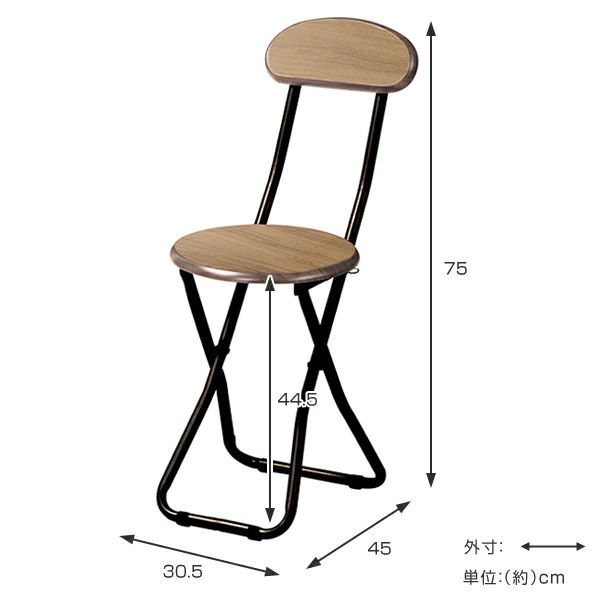 | サイズ | 約 幅30.5×奥行45×高さ75(cm) 座面高:約 44.5(cm) 折り畳み時:約 幅30.5×奥行7×高さ86(cm) |