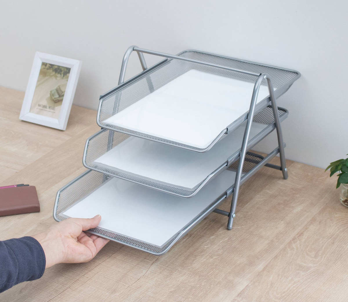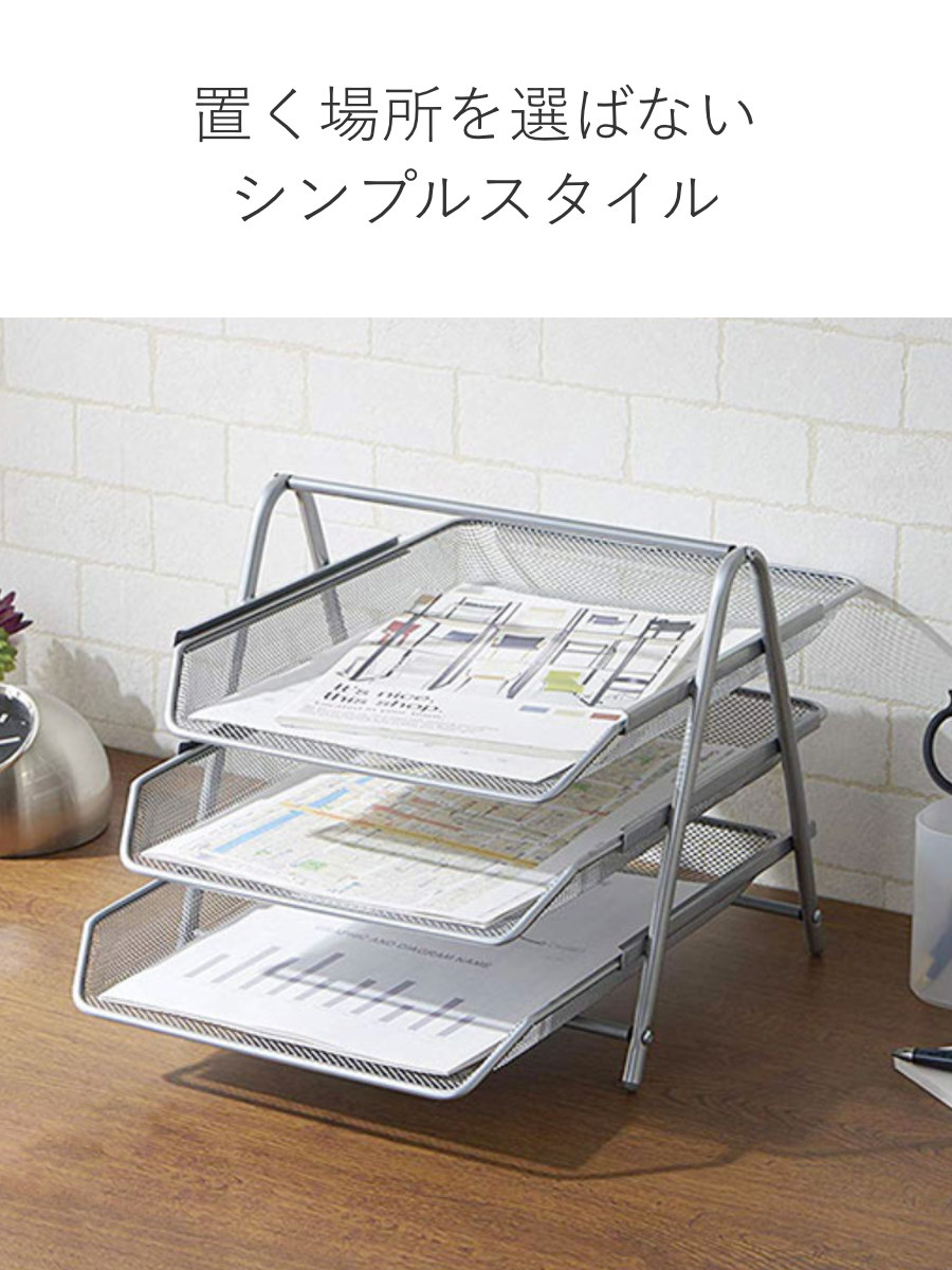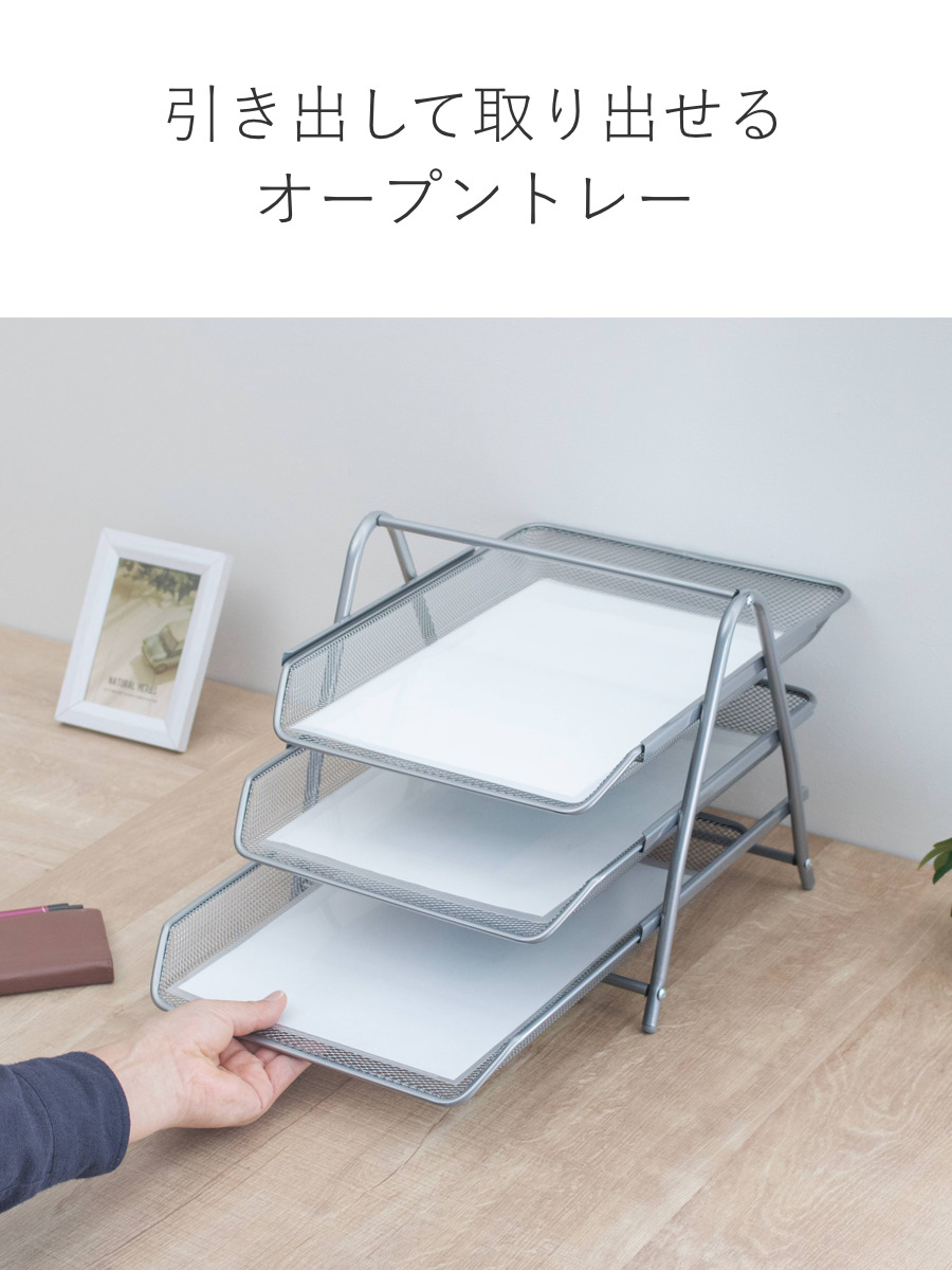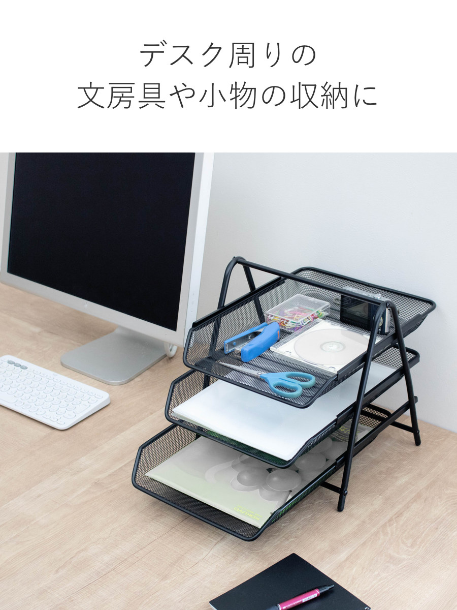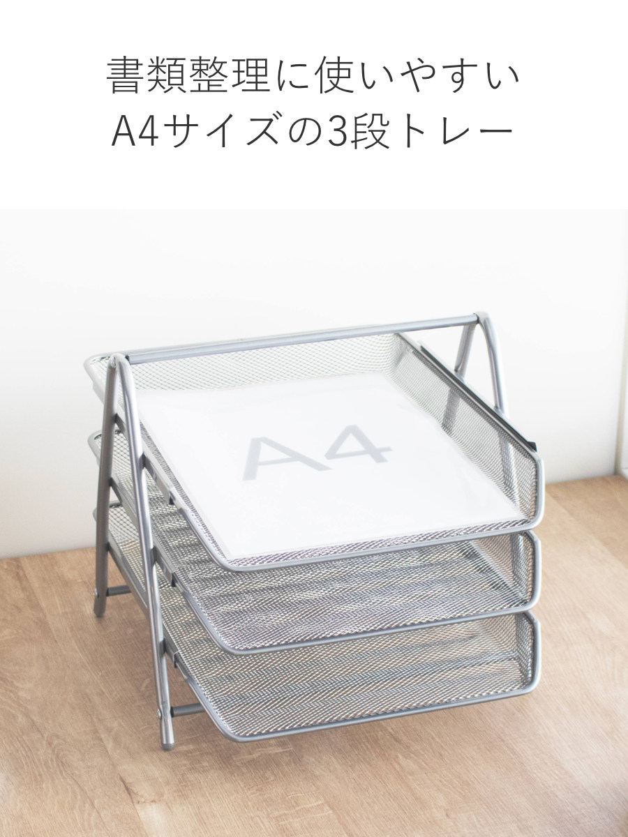 トレーはA4サイズのクリアファイルが収まるサイズ設計。縦に3段のトレーが付いているため、書類を種類ごとに分けて整理でき、デスク周りをすっきり整頓できます。