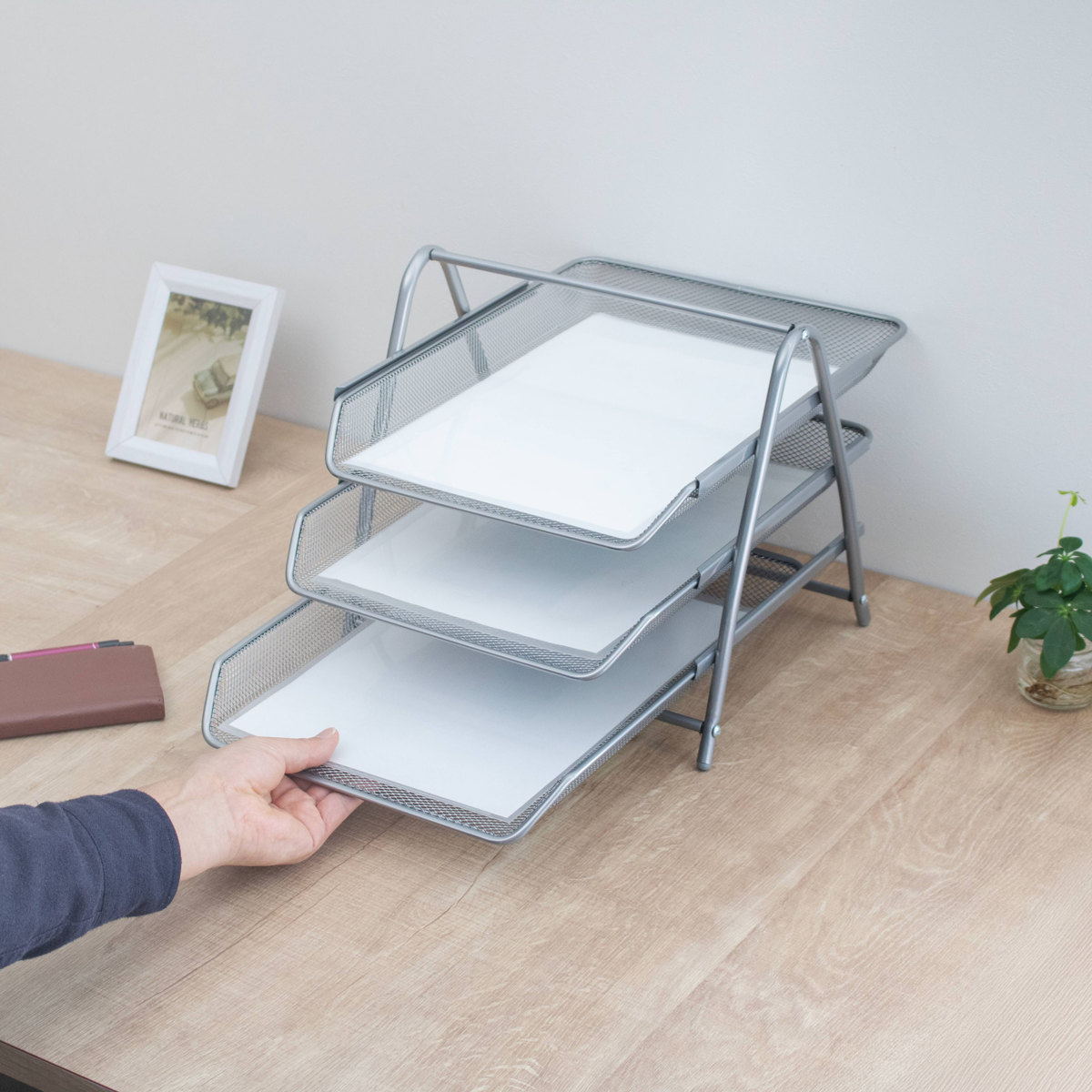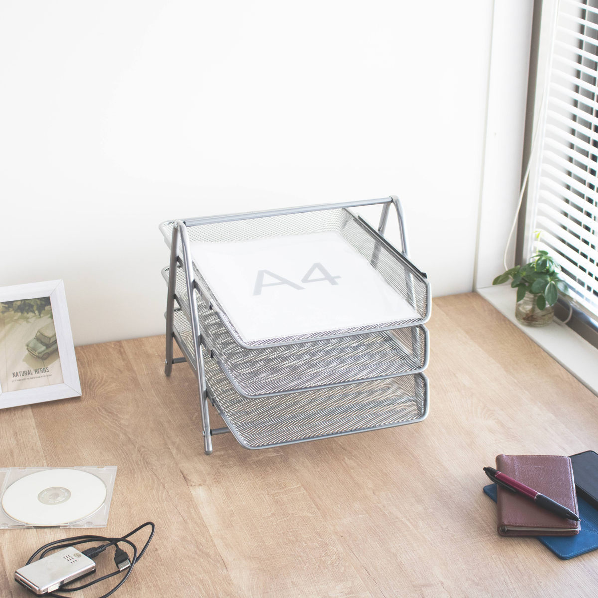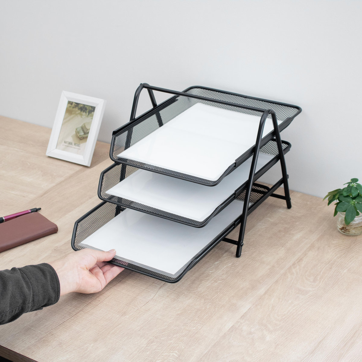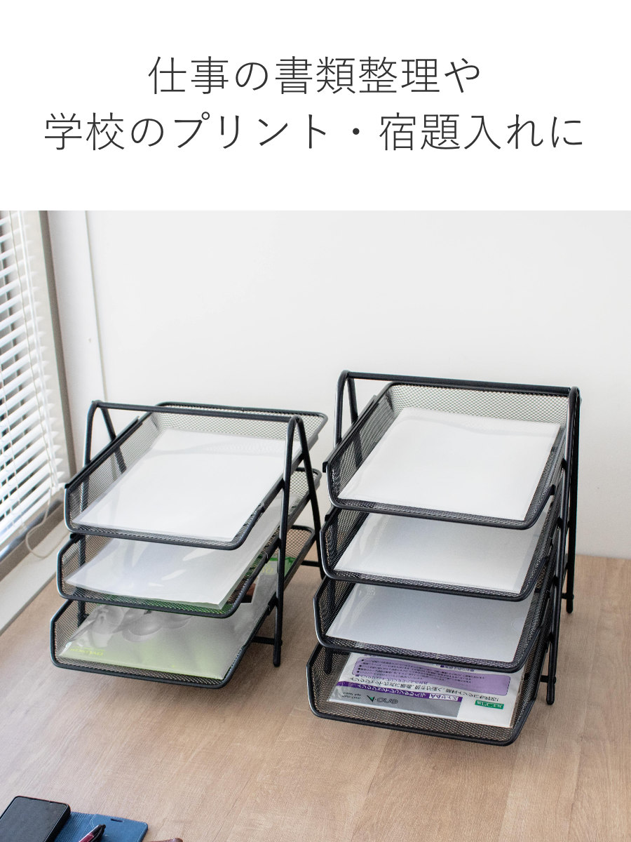 トレーはA4サイズのクリアファイルが収まるサイズ設計。縦に3段のトレーが付いているため、書類を種類ごとに分けて整理でき、デスク周りをすっきり整頓できます。