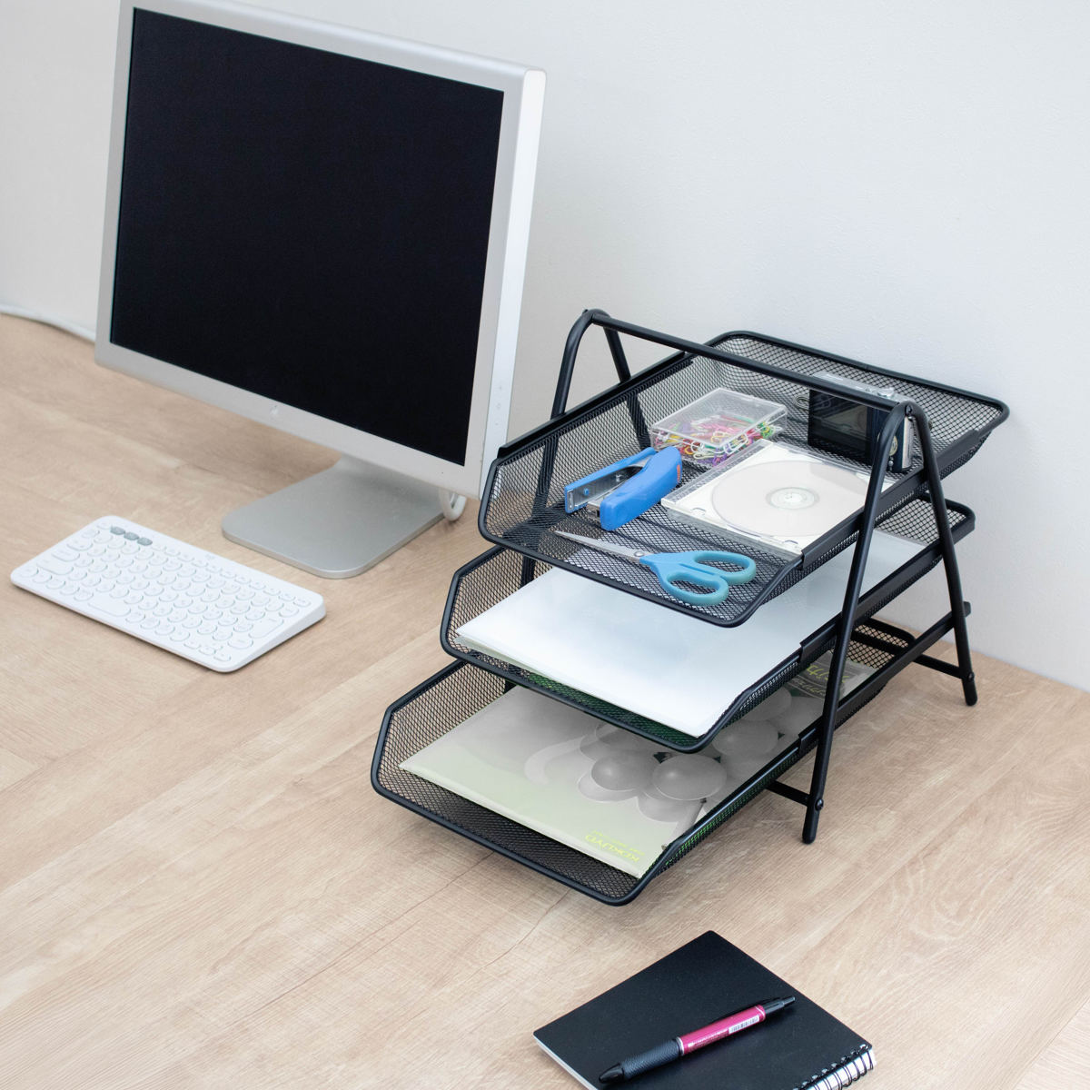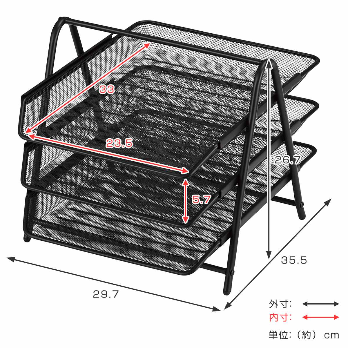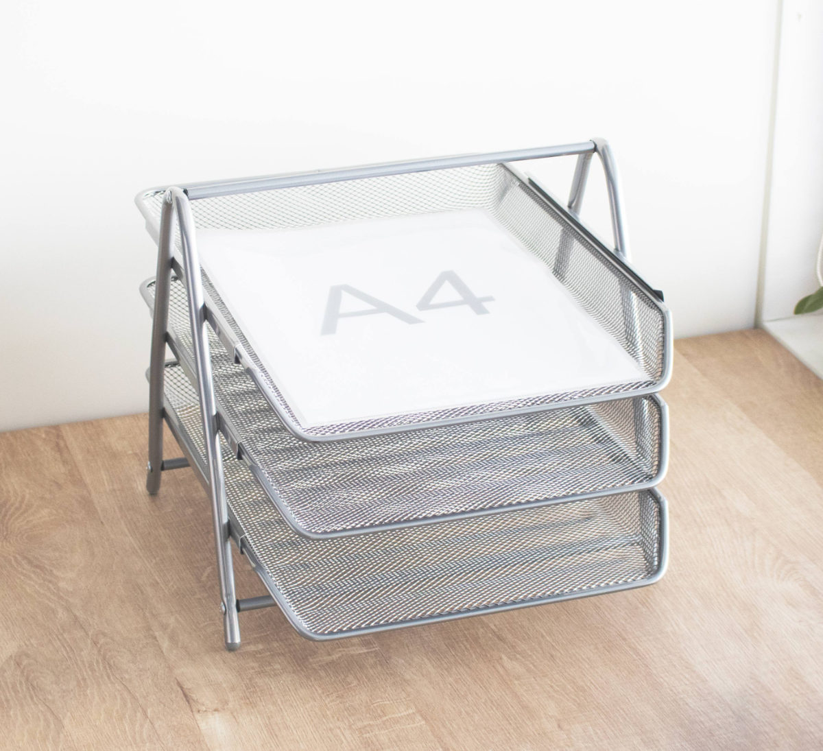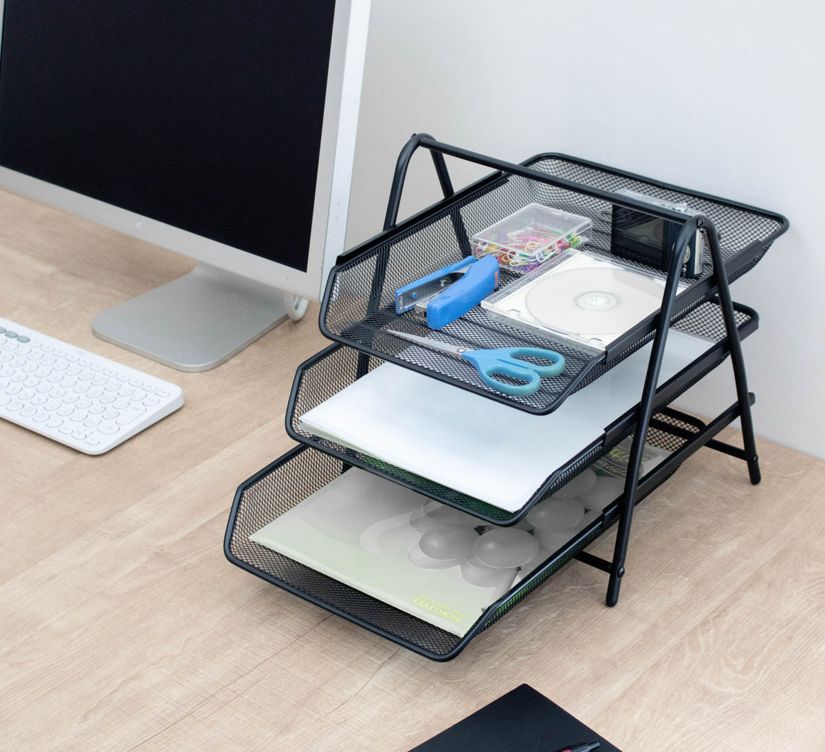 トレーはA4サイズのクリアファイルが収まるサイズ設計。縦に3段のトレーが付いているため、書類を種類ごとに分けて整理でき、デスク周りをすっきり整頓できます。