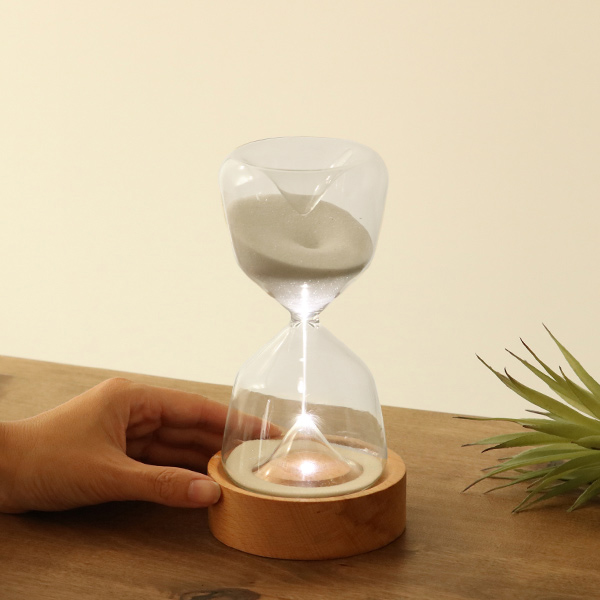 ●木製スタンドにLED照明が内蔵されていて、落ちる砂を輝かせます。