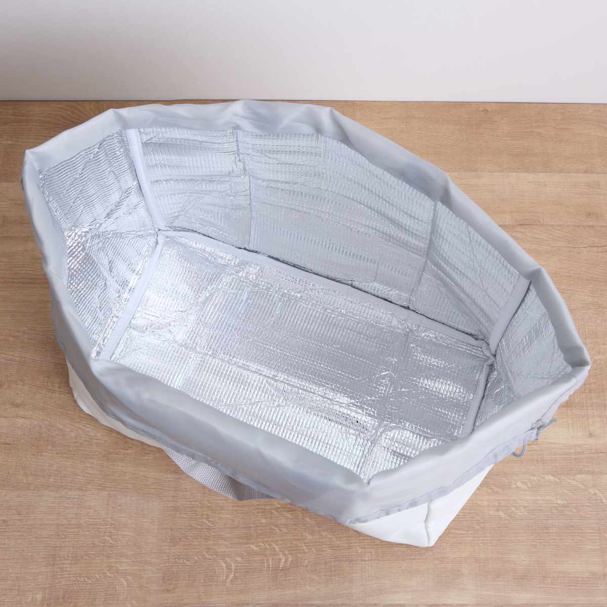 内側はアルミ加工が施されているので保冷効果があります。持ち帰りの時間が長くなったときも安心です。