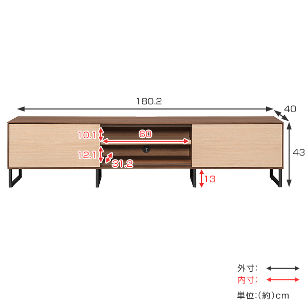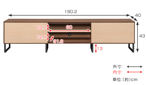 | サイズ | 約 幅180.2×奥行40×高さ43(cm) |
