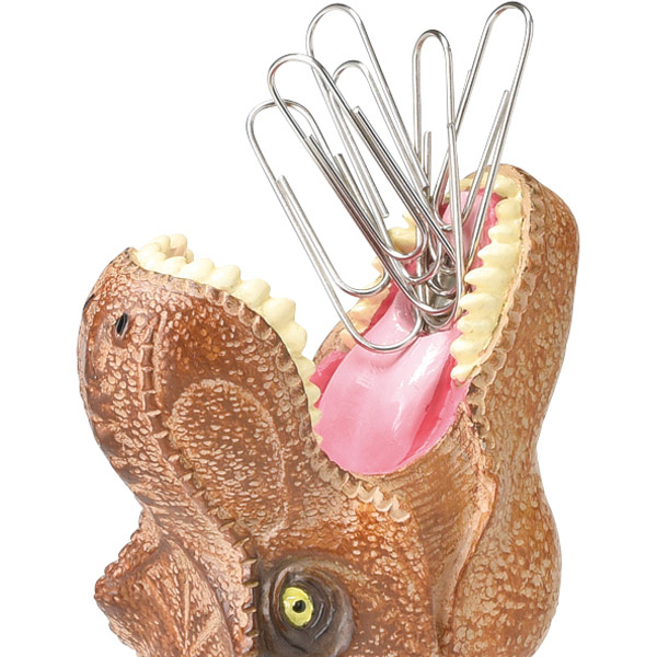 細部まで手の込んだリアルさが魅力的な、ティラノサウルスのクリップホルダーです。クリップも5個付属しています。机上がまるで恐竜時代に逆戻りしたような迫力があります。