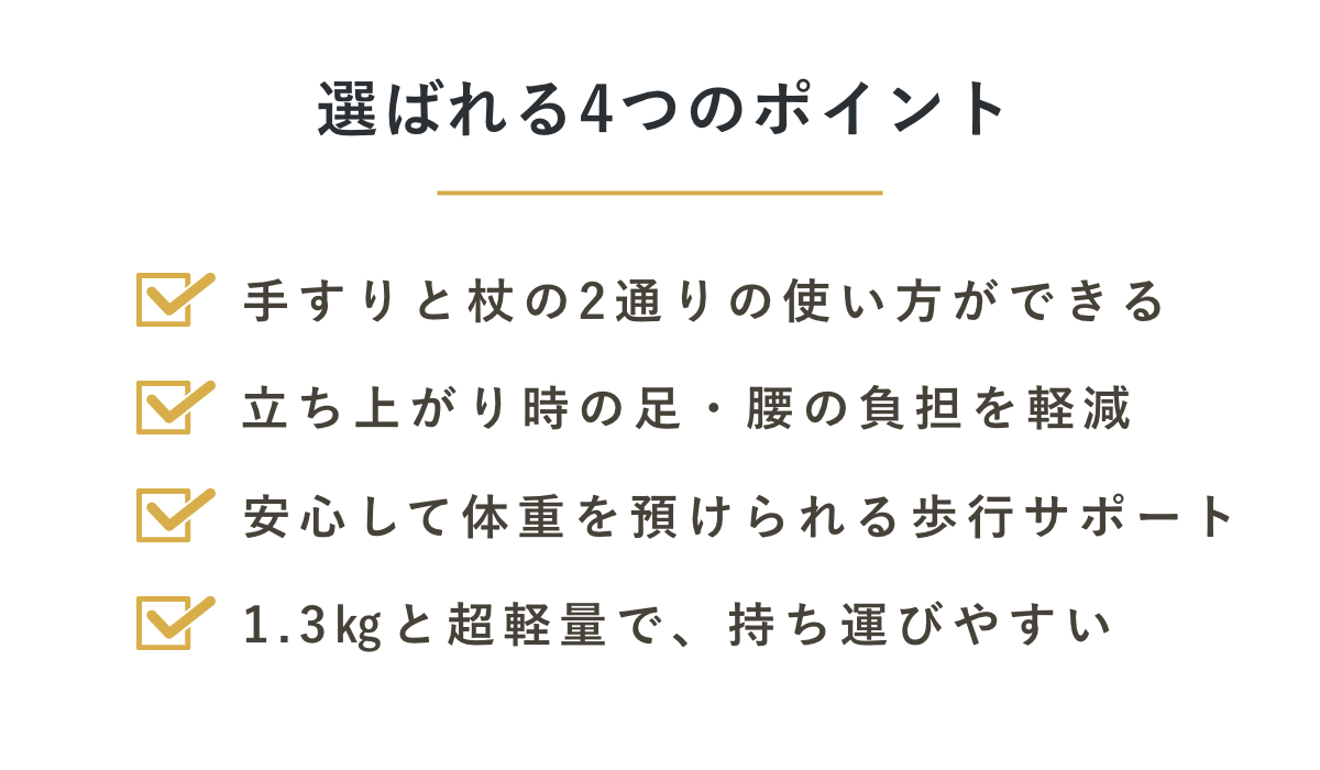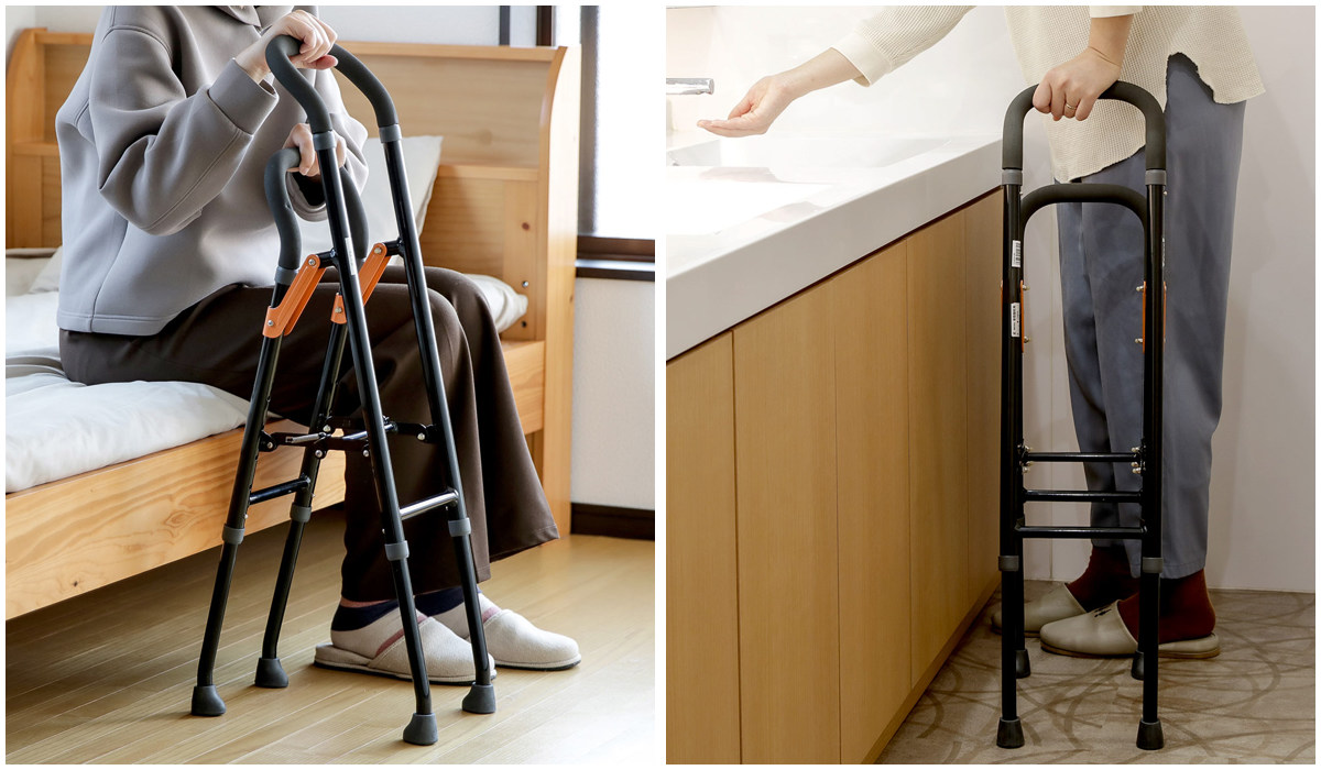 食事やトイレ、入浴時に伴う立ち上がりや移動をサポートします。立ち上がり時には手すりとして、歩行時には安定した杖として機能し、体への負担軽減に役立ちます。
