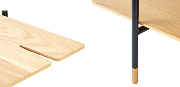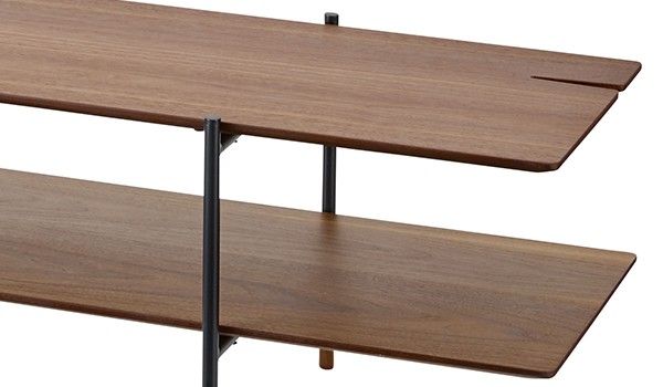 | 切り込みデザイン アクセントとして、木材の欠けを思わせる切り込みを入れています。シンプルでありながら個性を感じるデザインです。 | シャープな脚部 細身の脚はお部屋に圧迫感を感じさせず空間を広く見せます。スチール部分は耐久度が高く、傷やサビに強くお手入れも簡単な粉体塗装で仕上げています。 |