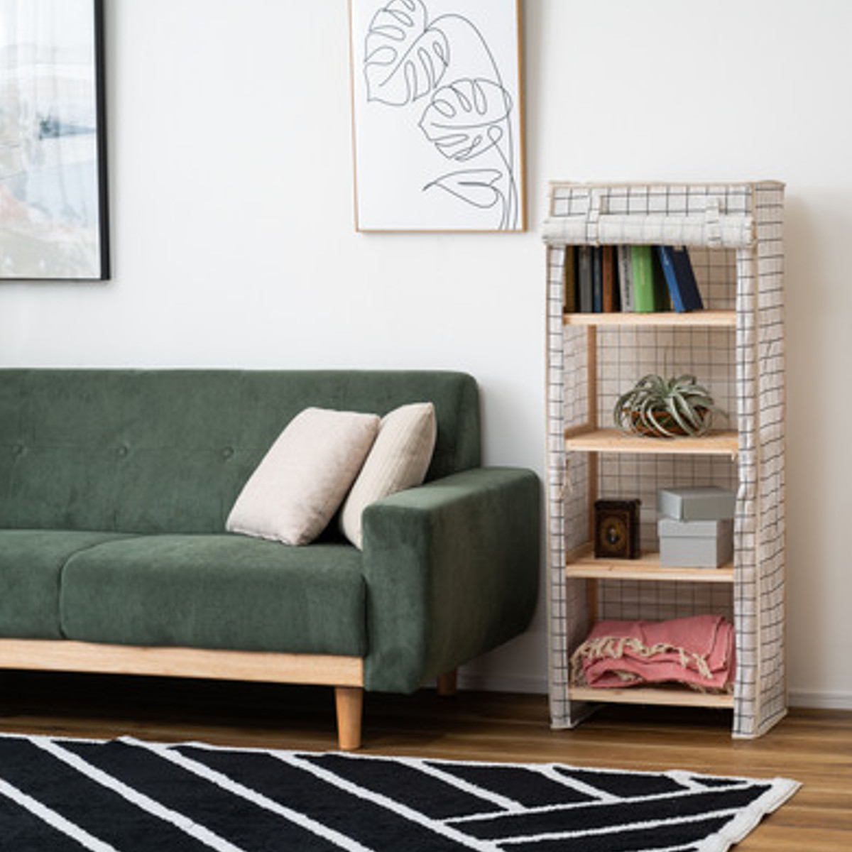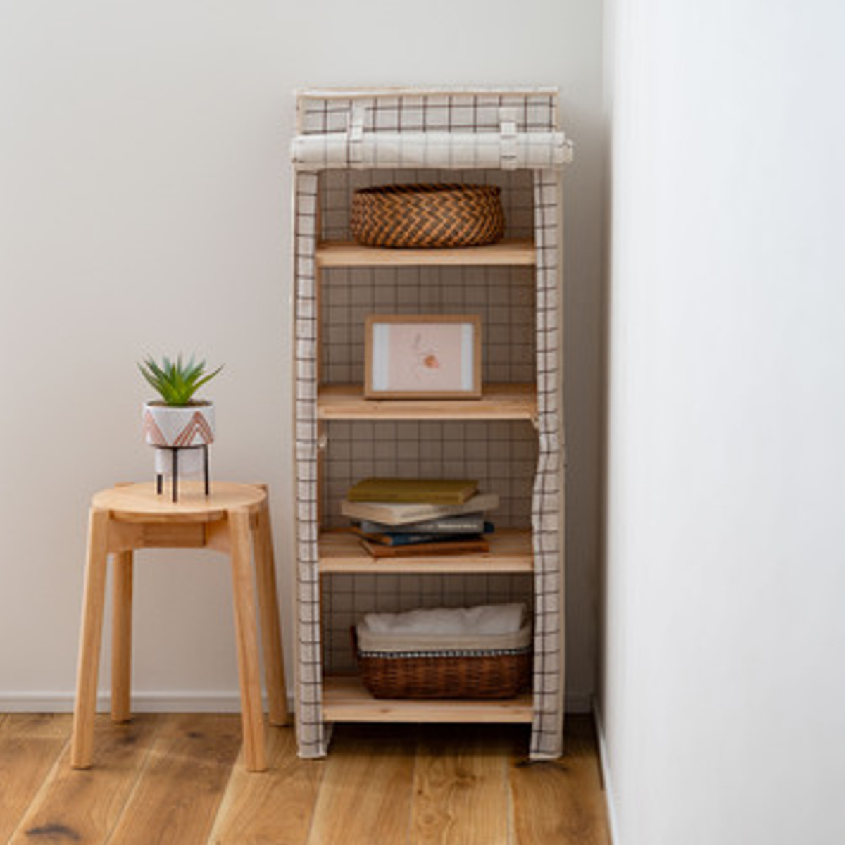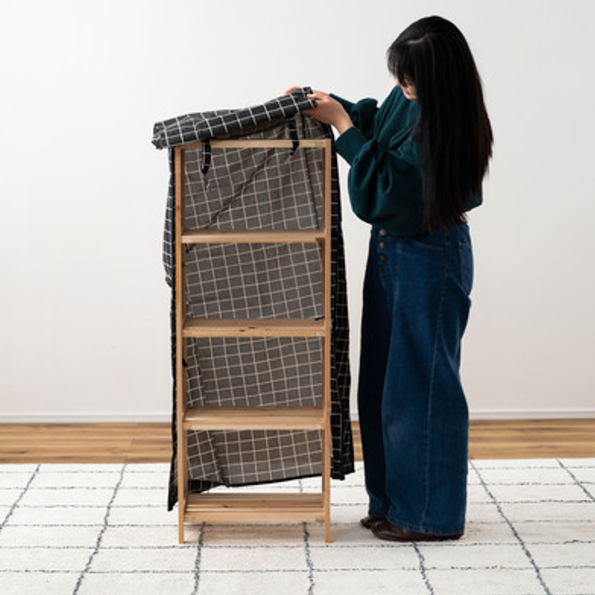 タオルや衣類の収納や、食品のストックなど多目的にお使いいただける、4段のウッドラックは一人暮らしのお部屋に丁度良いコンパクトなサイズ感です。ファブリックカバーをかけて、中身を見せずにすっきりと収納できます。