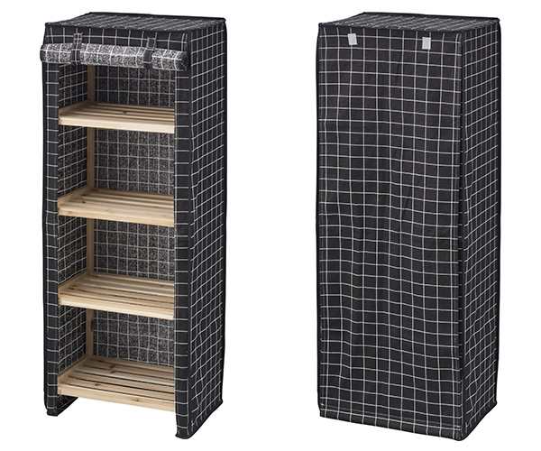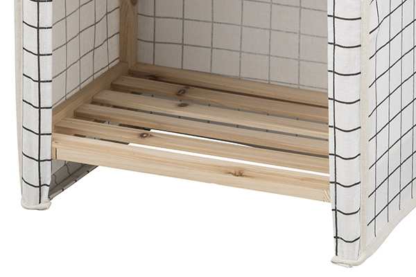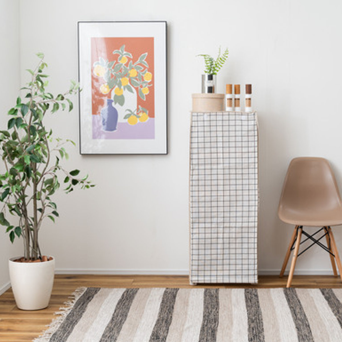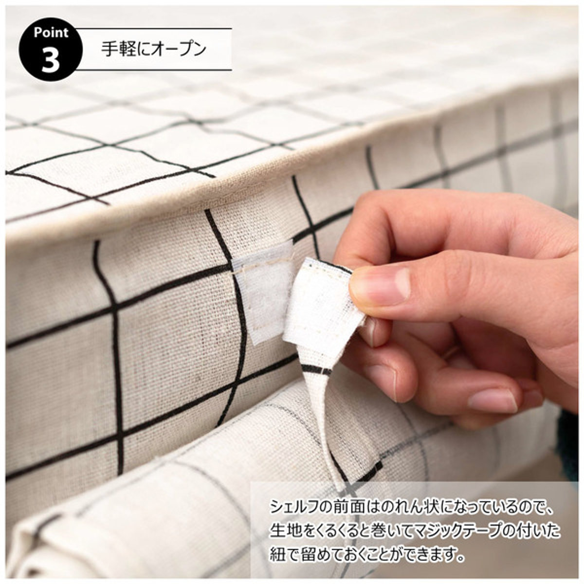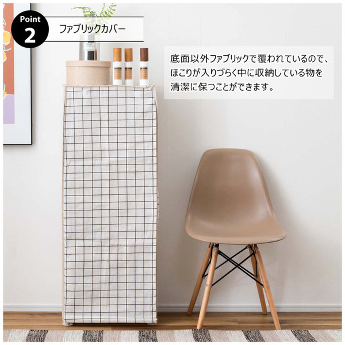 タオルや衣類の収納や、食品のストックなど多目的にお使いいただける、4段のウッドラックは一人暮らしのお部屋に丁度良いコンパクトなサイズ感です。ファブリックカバーをかけて、中身を見せずにすっきりと収納できます。