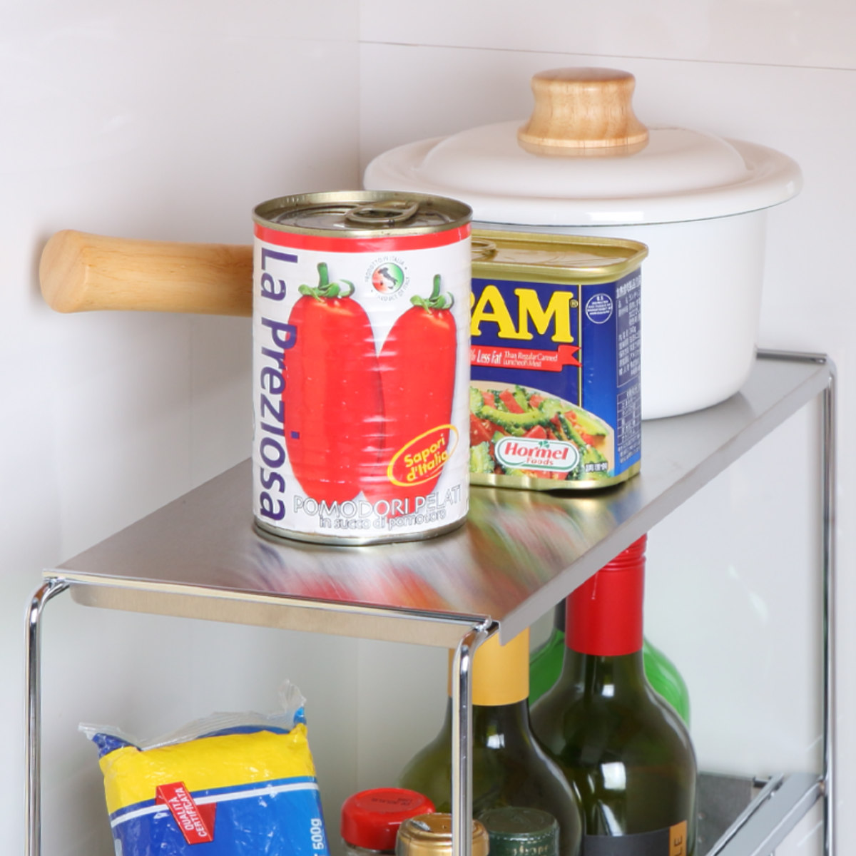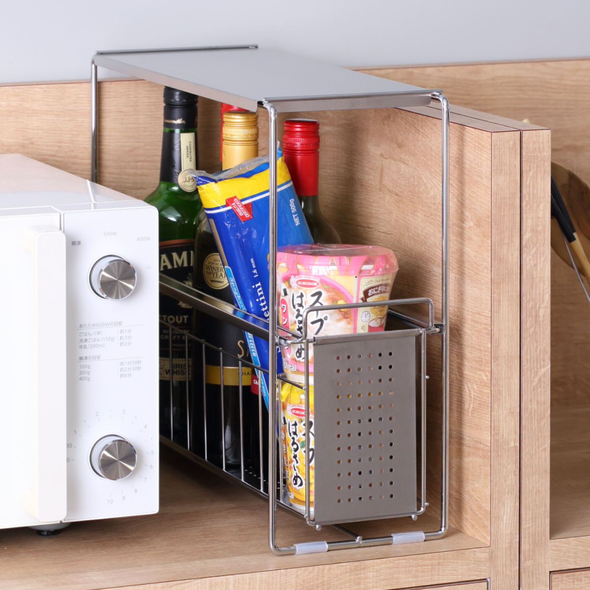 コンロ横のスペースに置いて調味料ラックとして使うのもおすすめ。調理中もサッと手に取ることができ、料理がはかどります。また、調理中の一時置きにも使えて便利です。
