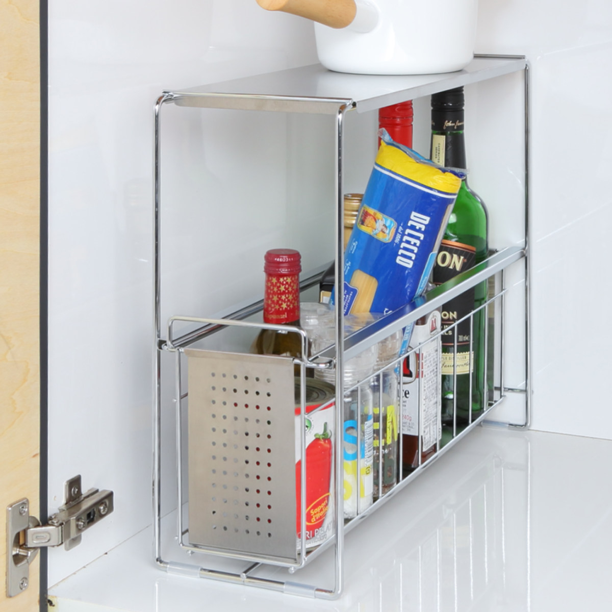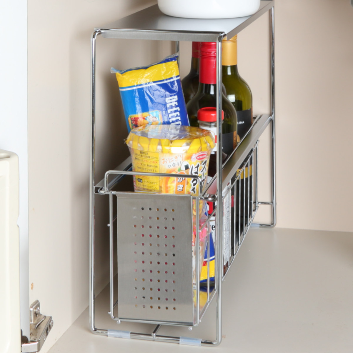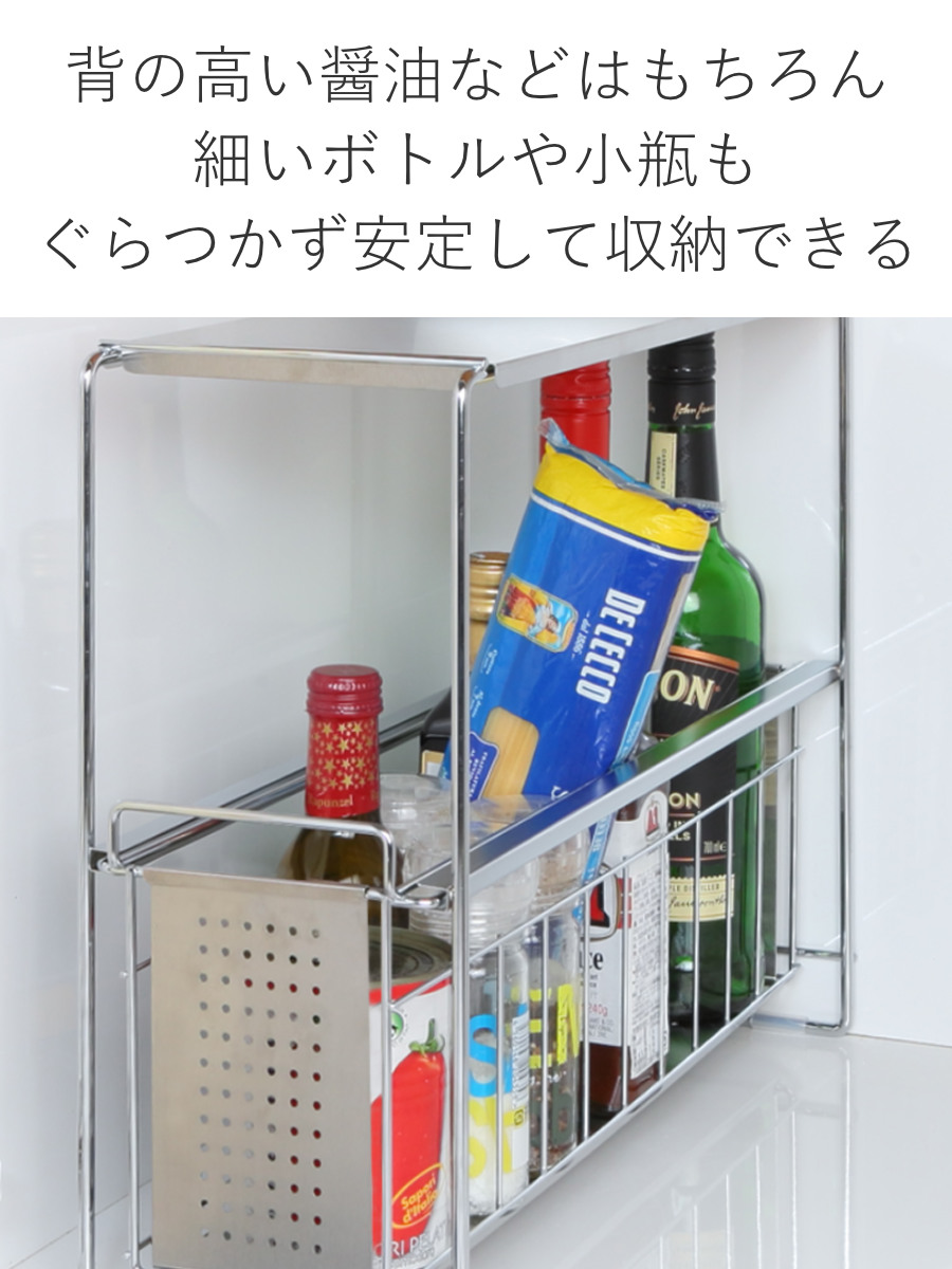 調味料や食品ストックなどで散らかりがちなシンク下をすっきり収納できるスライドラックです。幅15cmとスリムながらも抜群の収納力。背の高い醤油や油なども入れられます。シンクの下を占領していた調味料を整理することで、新たな収納スペースを確保することができます。