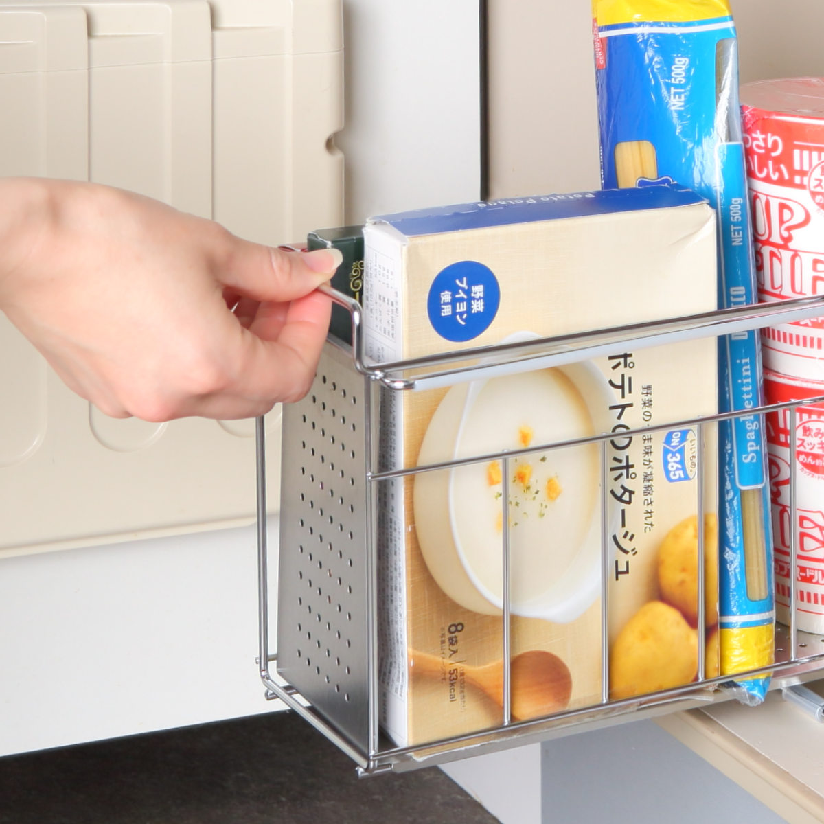 奥の方に収納した物も見つけやすく、サッと手に取れるスライド式。使い忘れて賞味期限が切れてしまったり、無駄に買い置きしてしまうことなく経済的です。