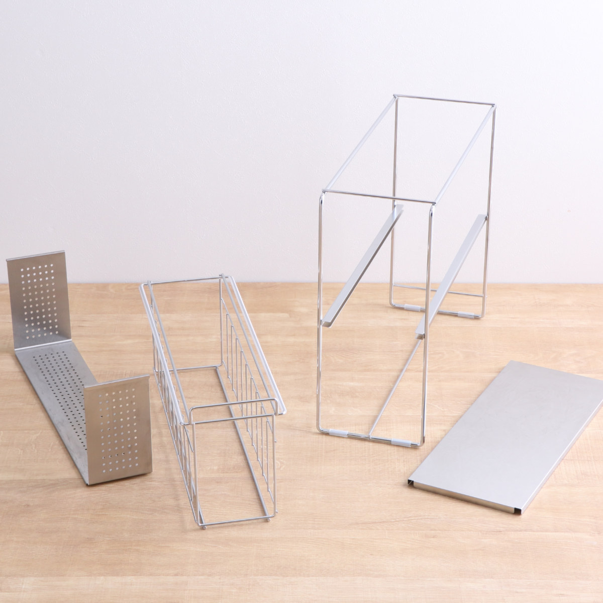 幅のサイズ違い・段数違いで全6種類ご用意しております。組み合わせて使えば、高さが統一され天板が綺麗なフラットになるように設計されています。組み合わせ次第で天板に大きめのお鍋や小物を収納可能。より機能的にお使いいただけます。