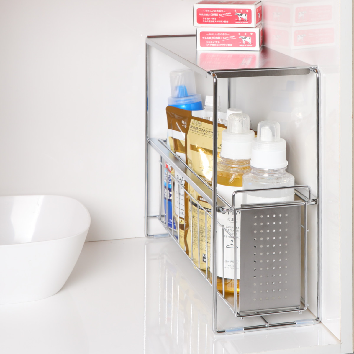シンク下での使用はもちろん、洗面台の下の収納にも使えます。シャンプーや洗剤のストック、掃除道具など細々した物もスッキリと収納できます。